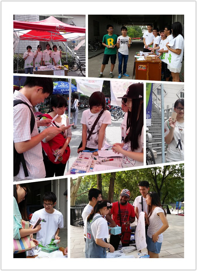 6月5日,武汉大学绿舟环保协会同学同校青协、武大资环院青协的志愿者在学校七大食堂,进行环保九宫格的活动宣传摆点。其中包括“绿色加油站”、珞珈寻“绿”。“绿色加油站”是指环保知识问答,旨在普及基本的环保知识,过关可以得到学生自己设计的书签。珞珈寻“绿”,是指拍摄校园中节水节电标语、鸟类宣传牌、植物宣传牌、废旧电池回收箱,收集够一定数量的的照片,就可以可以得到环保餐具一套。我们希望大家能够对这些身边的环保标示有更多的关注,不在做低头族而忽视了身边的这些细节,渐渐在大家心中建立环保意识,另外以环保餐具作为纪念品,也是希望大家减少一次性餐具的使用,践行绿色生活。