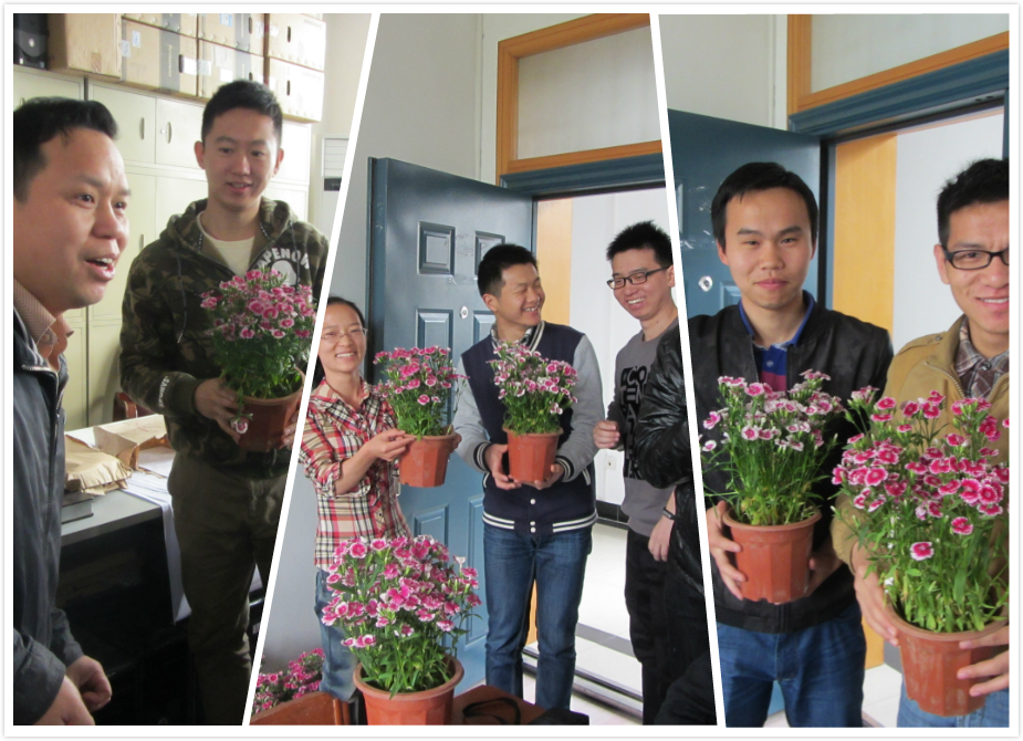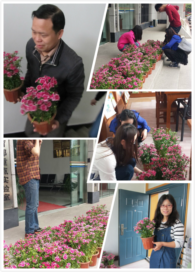 2015年4月20日上午9:30,在学院党委副书记江尧林老师、研究生辅导员周烨老师的带领下与研究生会干部一起为机房、实验室送去了研会精心准备的“石竹梅”。石竹梅是一种非常美丽的花卉,是中国传统的名花之一,其花语是一生一世、纯洁温馨,象征着母亲纯洁、永恒的爱。而学院对于每位研究生而言,就如母亲般的存在,因此,为每个机房送去美丽的“石竹梅”,代表着学院对研究生们的点滴关爱,它们不仅可以净化空气,美化机房的环境,还能缓解学习的疲劳与压力,使人心情愉悦。从同学们欣喜的表情与温暖的微笑中可以看出,学院送去的温暖春风已吹进每一个人的心里,这也是对本次活动最好的回应!在此也感谢我们研会所有的工作人员,你们辛苦了。