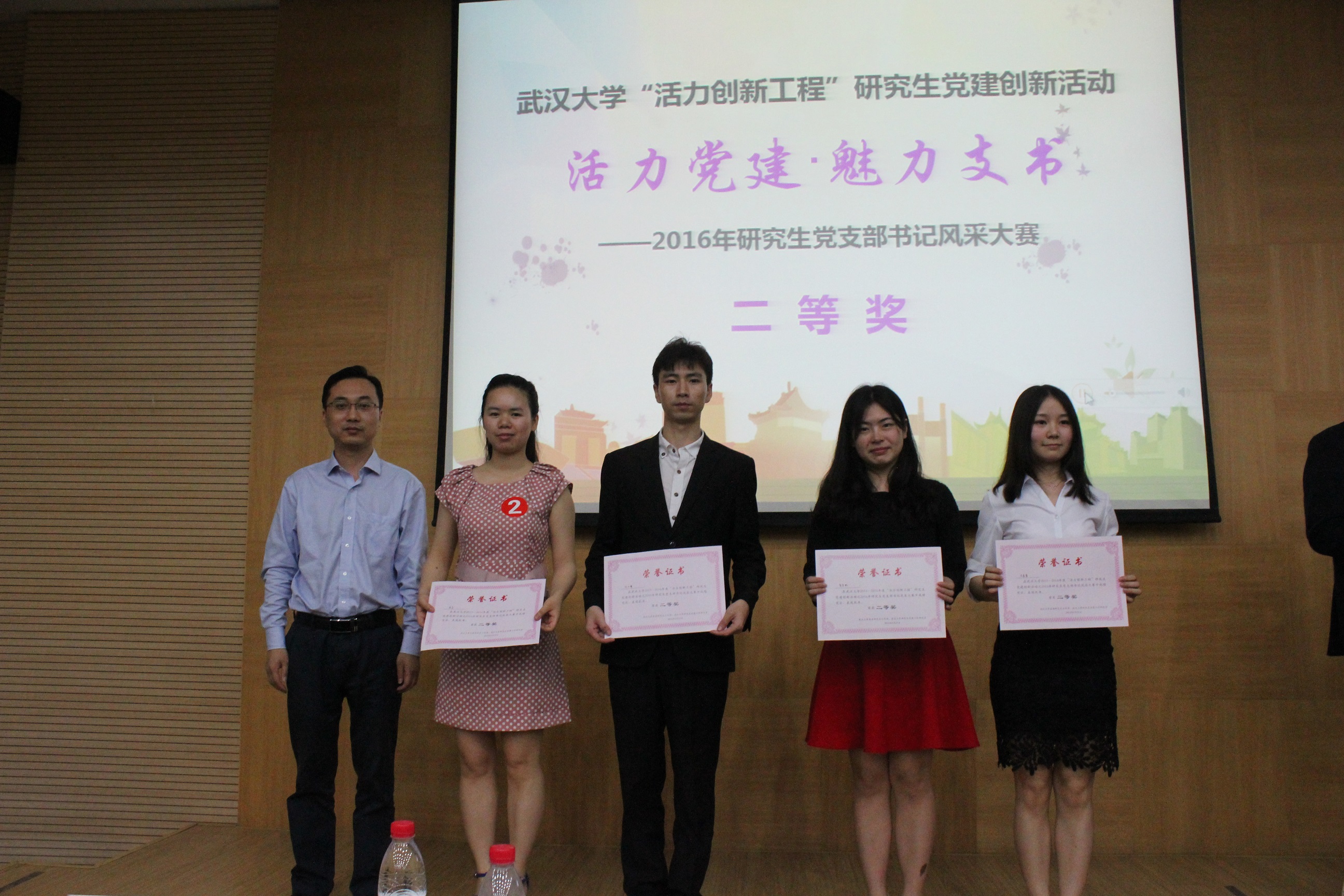 2016年5月25日,以“活力党建·魅力支书”为主题的武汉大学“活力创新工程”研究生党建创新活动暨2016年研究生党支部书记风采大赛决赛举行。经过四轮激烈角逐,我院土地资源管理专业2014级硕士研究生党支部书记贺李帆同学荣获二等奖。