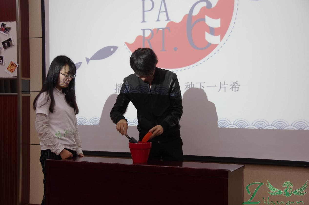介绍完毕,由张子之学长播种下第十一届珞珈绿色文化节的第一颗种子并进行以绿色字词为背景的游戏环节,活动也由此与种子为伴,接受着这颗种子带来的生命力,在以后的日子里蓬勃成长。