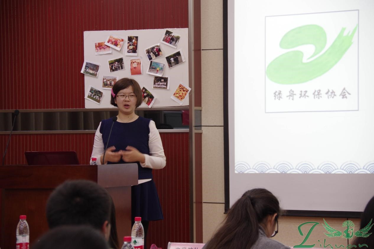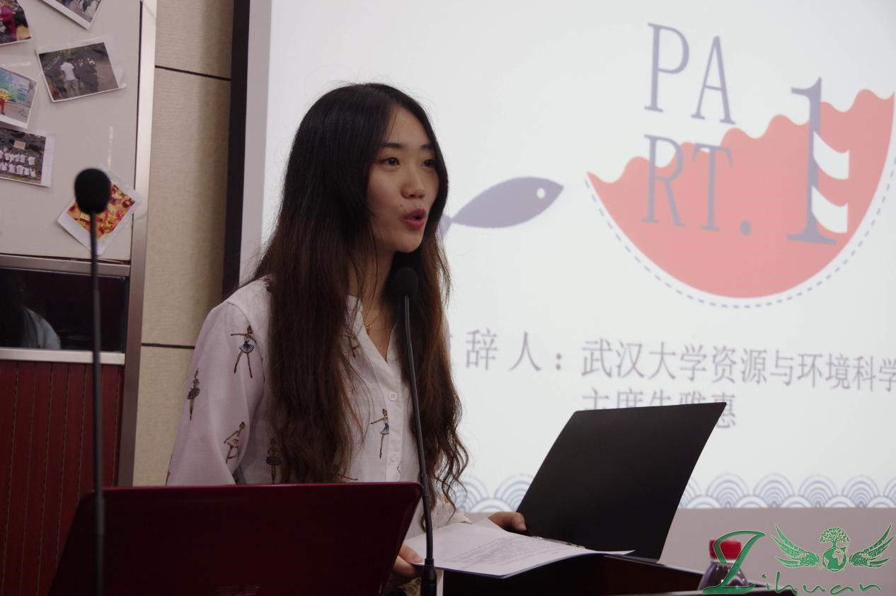 接下来是武汉大学绿舟环保协会会长余思琦学姐发言。其间,学姐介绍了绿舟环保协会的发展过程及举办的活动。余思琦学姐提出,绿色是一种简单的践行方式,是可以由点滴养成的习惯。“虽然我们举办了很多绿色活动,譬如废旧电池回收、清扫珞珈山等,但是绿色不应该只局限于活动之中,环保不该只是口号,而是大家共同的意识与责任。”余思琦学姐简单的一席话却是让绿色的理念深入人心。