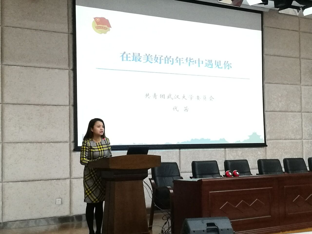 最后,由校团委副书记代茜以“在最美好的年华遇见你”为题,给各位团校学员作了有关团史团情的介绍。在讲课中,她回顾了共青团的光辉历史,给全体学员介绍了有关武汉大学共青团的方方面面,使学员们对共青团以及武汉大学共青团有了更深入更清晰的认识。她引用了团中央第一书记秦宜智的重要讲话内容:在校园里,你们是各级学联、学生会组织的负责人,是连接团委与学生的桥梁。来告诫学员们做学生干部的真正意义。