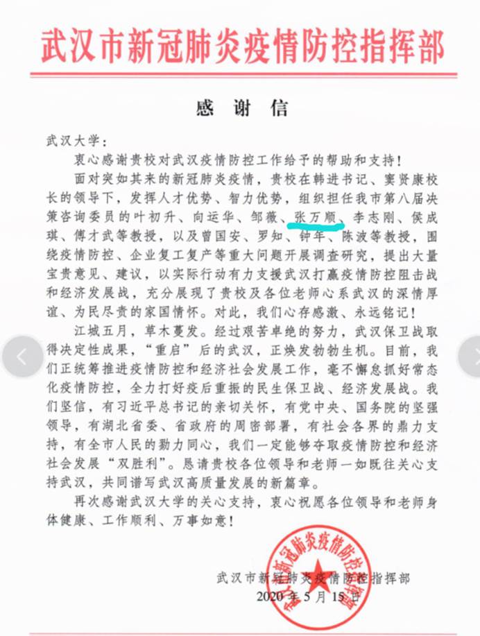 武汉市新冠肺炎疫情防控指挥部来函:感谢我院张万顺教授在疫情防控工作中的智力支持