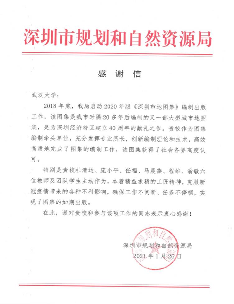深圳市规划和自然资源局来函:感谢杜清运教授团队的高效高质工作