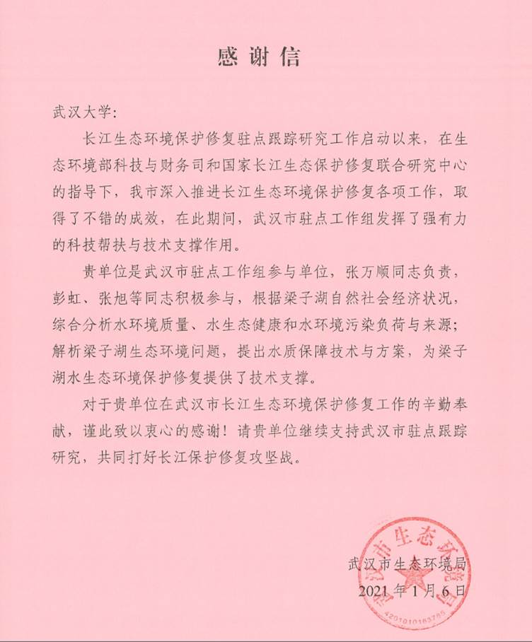 武汉市生态环境局来函:感谢张万顺教授、张旭副教授为梁子湖水生态环境保护修复提供技术支撑