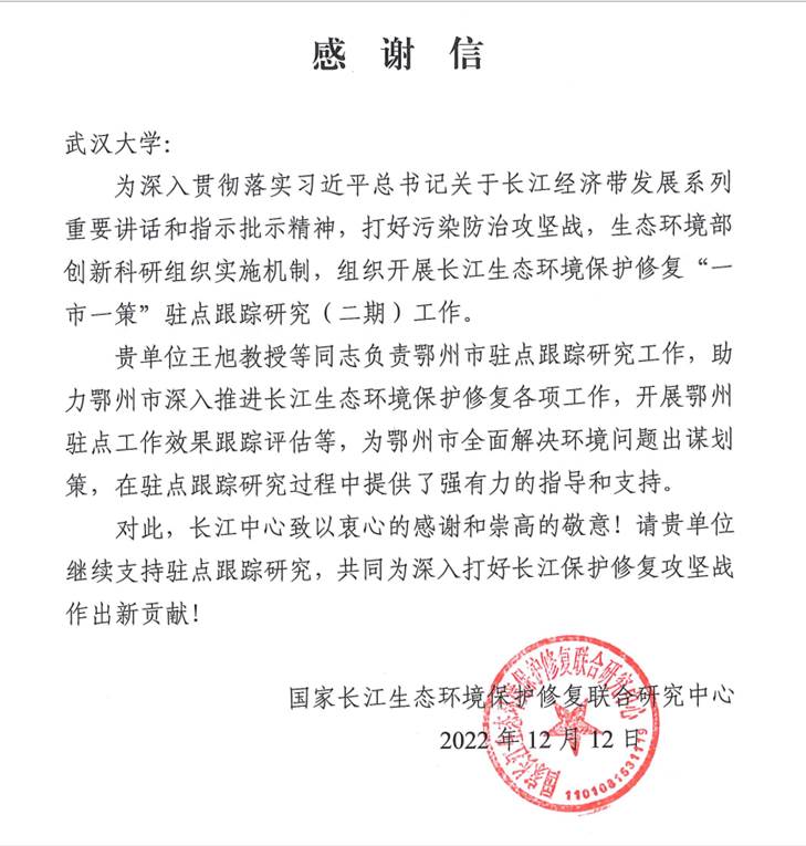 国家长江生态环境保护修复联合研究中心来函:感谢我院王旭老师为鄂州市驻点跟踪研究工作提供强有力的指导和支持
