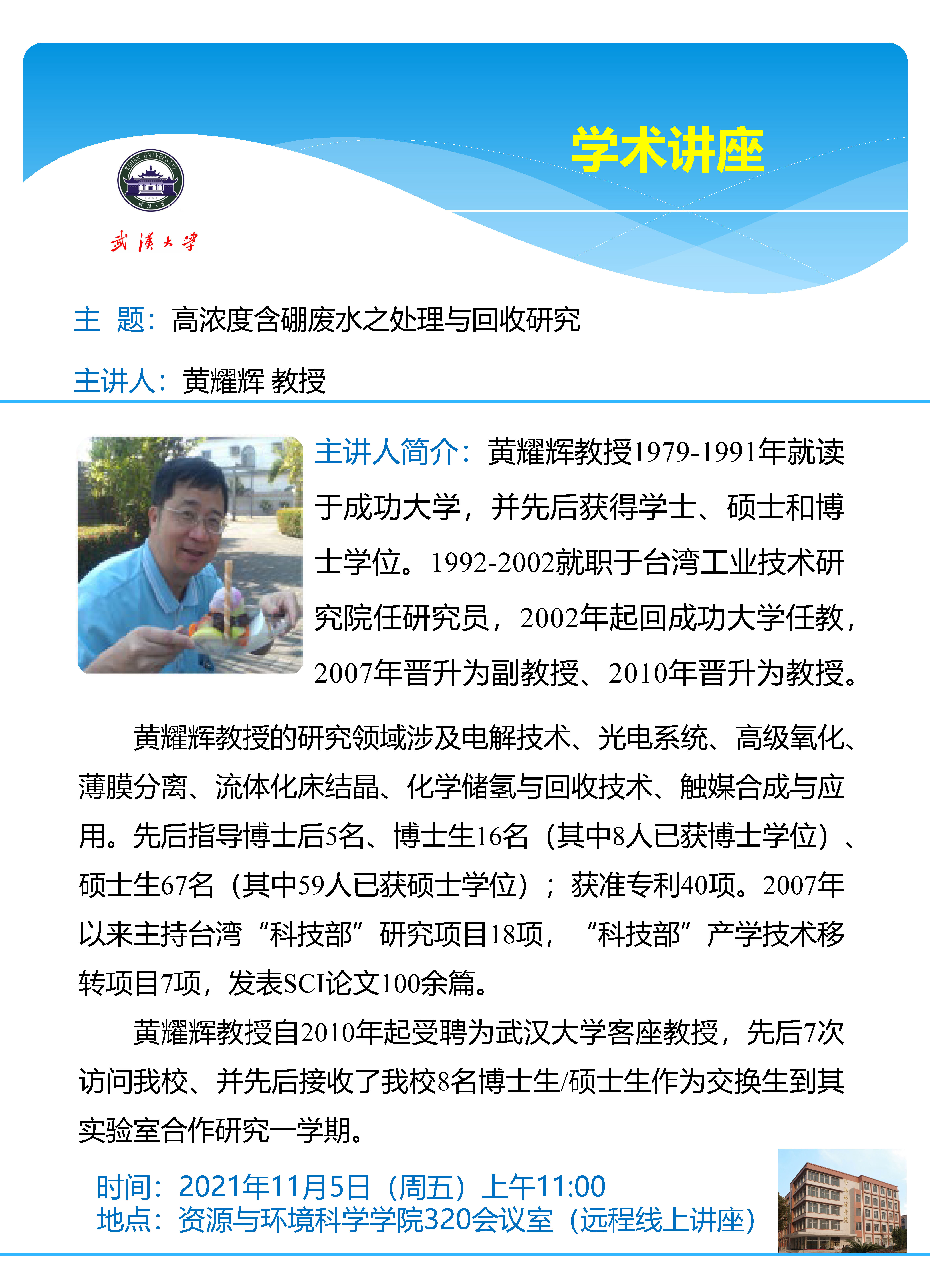 11月5日上午成功大学黄耀辉教授:高浓度含硼废水之处理与回收研究