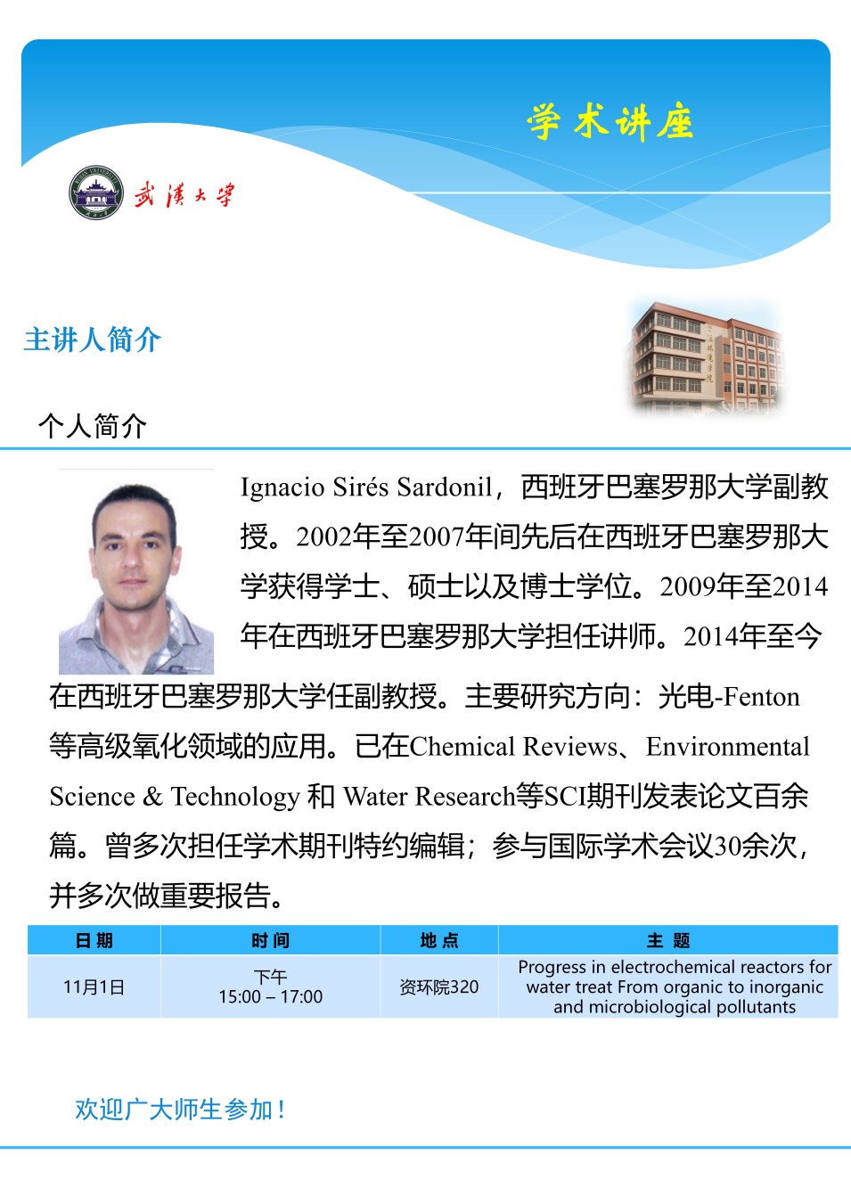 11月1日下午,Sirés教授进行了题为“Progress in electrochemical reactors for water treat From organic to inorganic and microbiological pollutants”的讲座,讲座首先介绍了电化学反应器这一反应体系,详细介绍了其原理及所适用的场合。讲座分别向同学们介绍了电化学反应器在处理水环境中存在的有机污染物、无机污染物以及微生物污染中的应用以及使用电化学技术从废渣中回收贵重金属的应用。讲座兼具有学术前沿性和实际应用性,对尚未接触电化学反应器这一概念的同学起到了科普启蒙的作用,同时又对已经在该领域有一定涉足的同学有着拔高点醒的作用。
