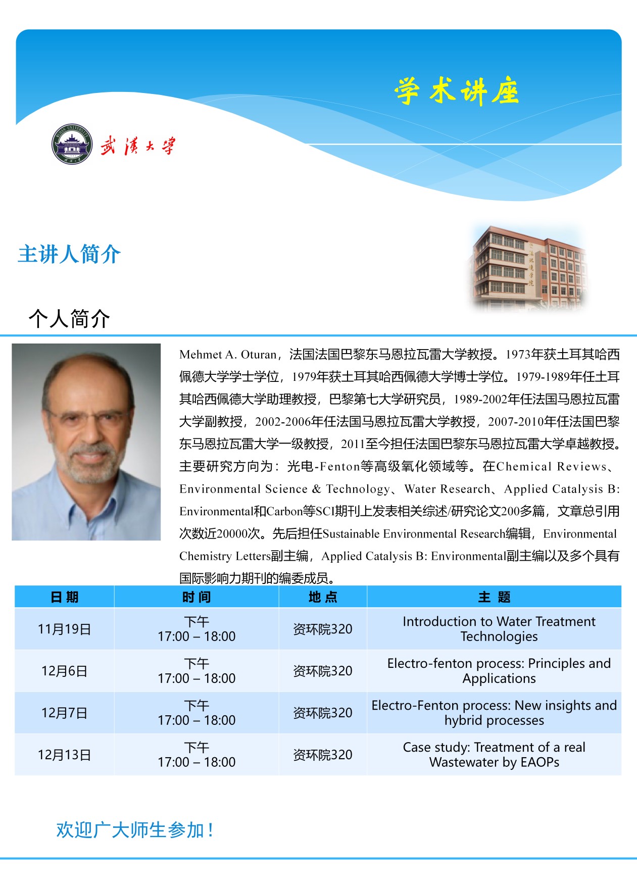 2021年11月19日至12月13日,应开云电竞官方网张晖教授的邀请,法国巴黎东马恩拉瓦雷大学终身教授Mehmet A. Oturan老师为学院硕士及博士研究生开展了4次高级氧化技术方面的课程讲座。