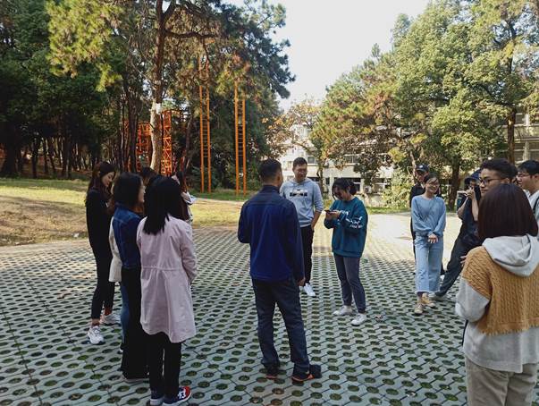 本次素质拓展活动主要围绕挑战、合作、信任等方面开展。活动共有18人参加,下午13:00时,同学们搭乘公交车到达中国地质大学(武汉)北区素质拓展训练基地。大家暂时忘却科研生活的压力,远离平日工作的辛苦,给自己些许的释放。
