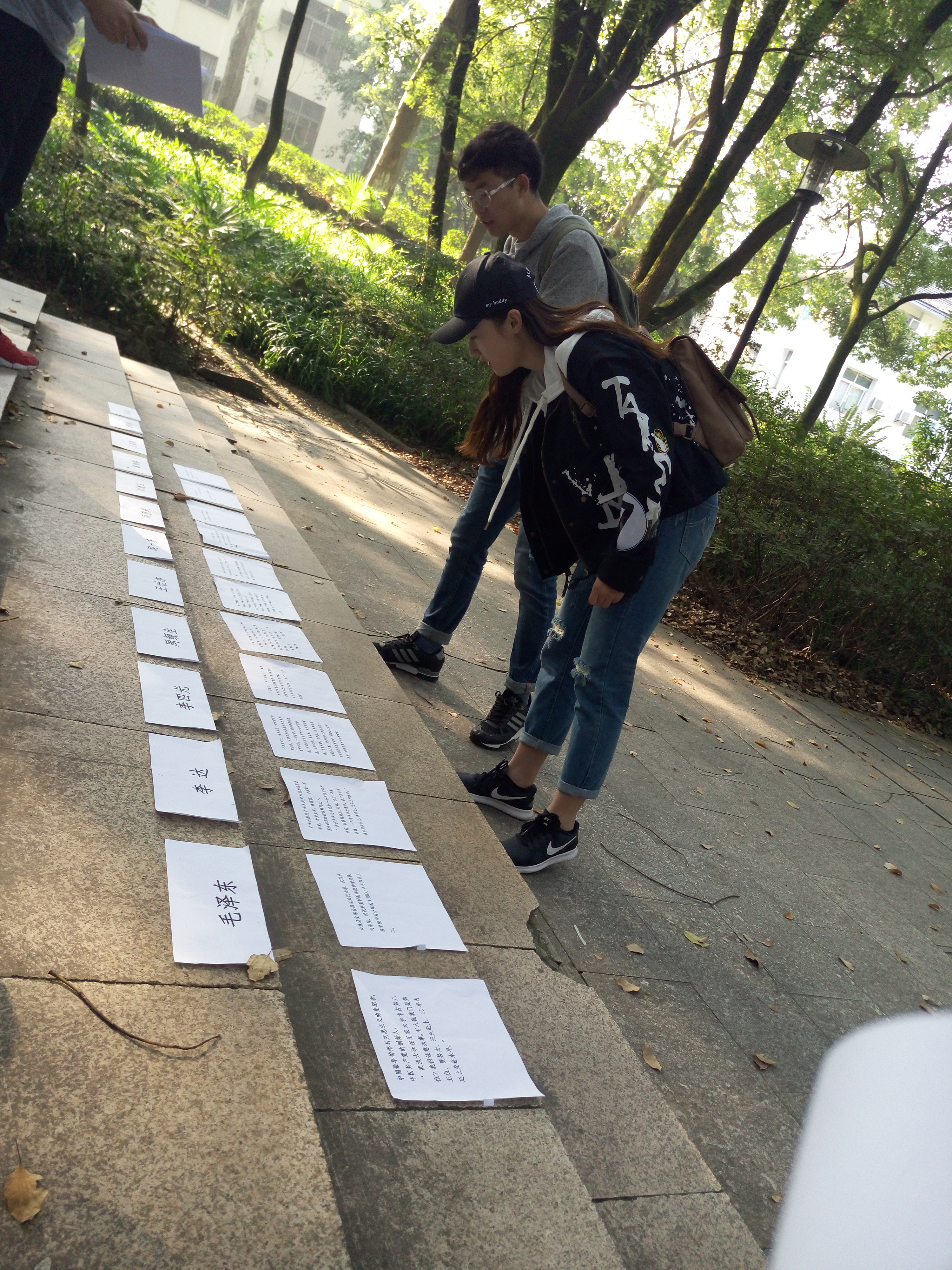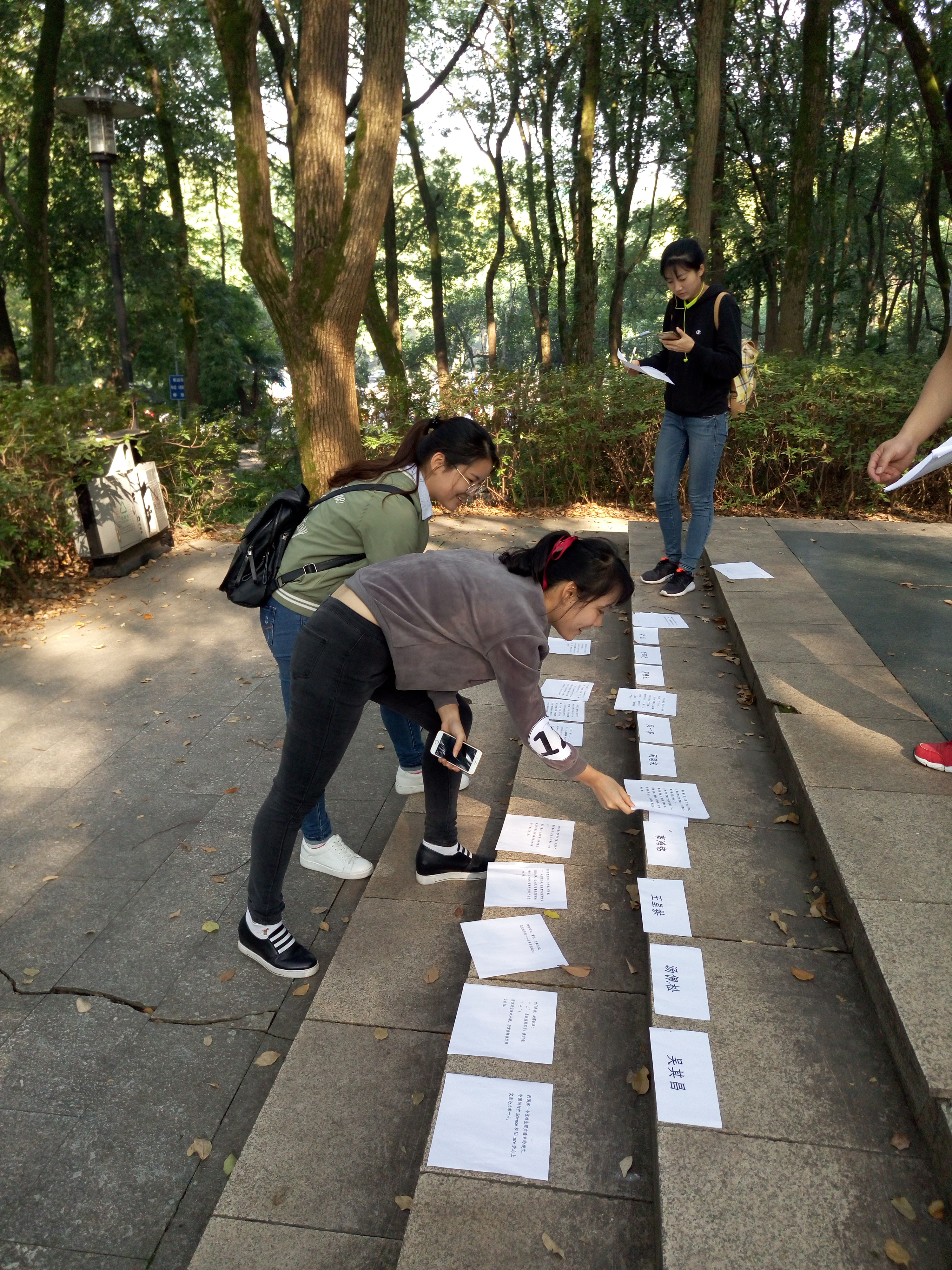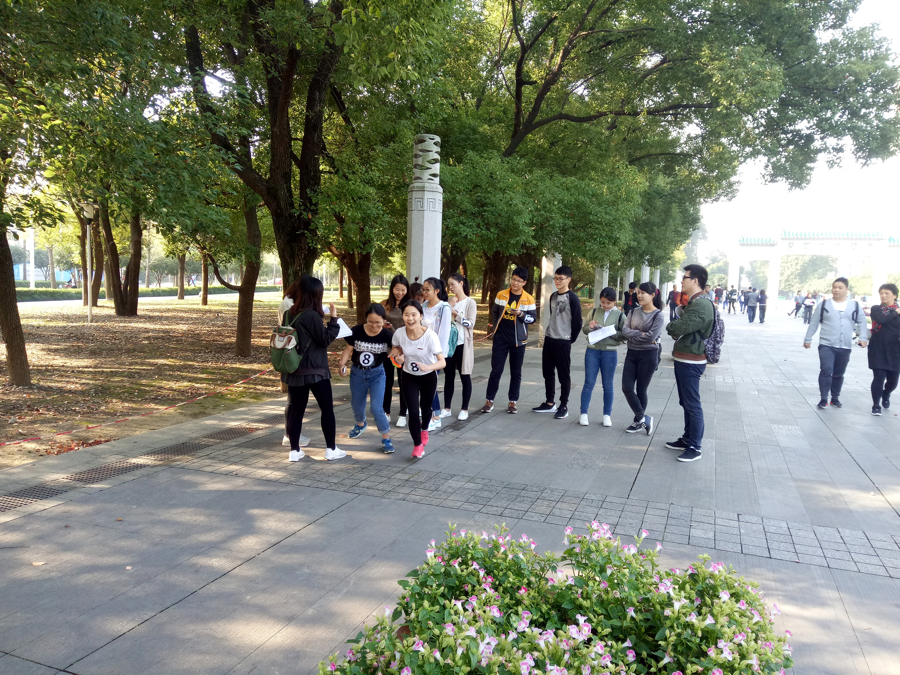 此次活动分为五个关卡:(1)正门牌坊:连线十九大——说出关键词;(2)“六一亭”:一触即发——党建知识简答;(3)李达雕像:追根溯源——武大的红色历史人物知多少“连连看”;(4)九一二操场:疯狂来往一起跳——你说我猜+跳绳;(5)老图樱顶:齐力冲顶——两人三脚+校史问答。活动于上午9时准时打响,工作人员按照策划书内容进行赛前培训与合理分工,提前一个小时到场进行场地布置,与此同时,参赛人员两两组队,不分年级与性别,则按照指定路线与内容展开活动。活动伊始,参赛队伍提前10-15min到达正门牌坊抽签决定出赛顺序,然后贴上相应的号码牌,等待开始答题指令。
