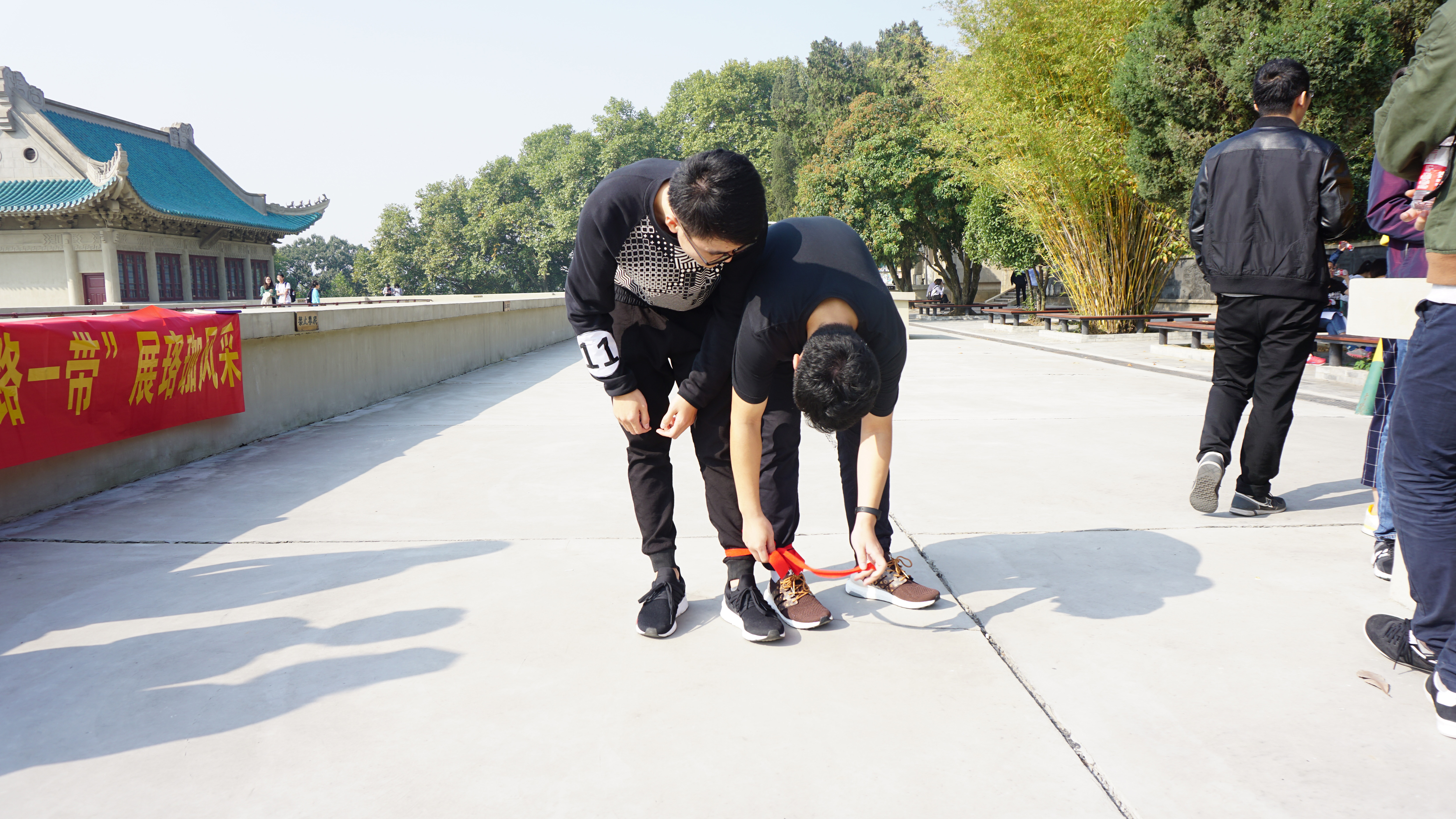 关卡5,在起点处每组2人一字排开将相邻队员靠在一起的腿用绳子系起来进行“2人3足”比赛,听到哨声后互相配合前进至终点回答校史问题后返回起点。