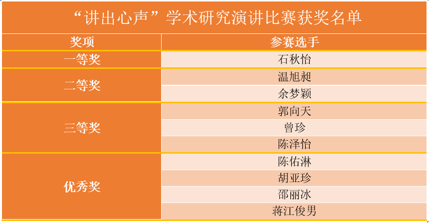 在最后的评委点评环节,土木建筑工程学院伍阳老师提出,人生是一场马拉松,在学术的道路上我们要不断地给自己提出一个个小目标,一步一个脚印的坚守着自己的梦想;李韩老师也表示,通过组织开展这样一个活动,将“学术”与“心声融合,能够了解同学们在科研中心中的所感所想,是非常具有意义与价值的;梅老师指出,每个参赛选手都展现了自己在学术生活中最真实感想,讲出了心声,希望大家能够不再害怕什么,在未来的科研旅程中能够轻装上阵。