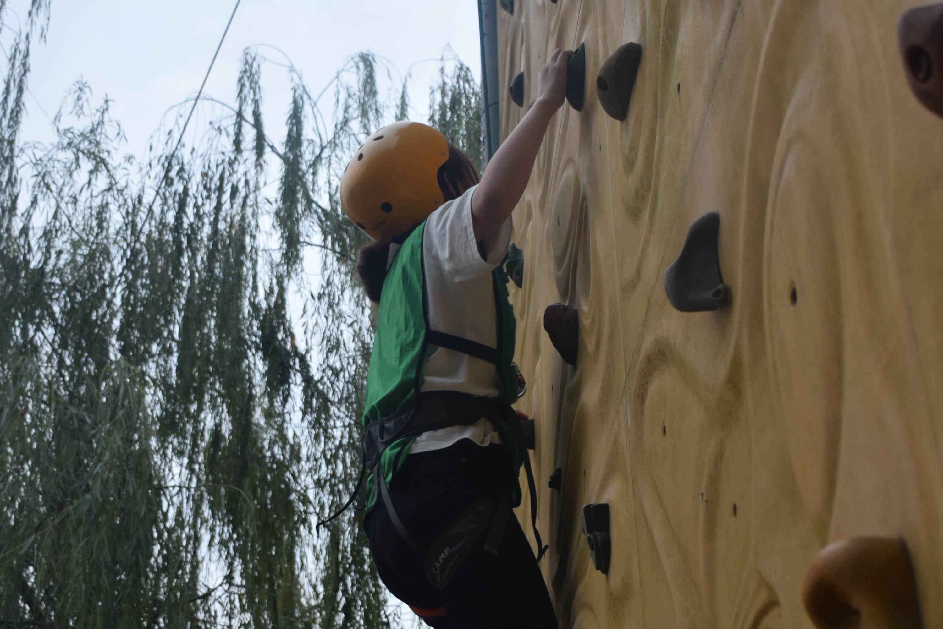 在教练的带领下,同学们来到攀岩体验项目。随着攀岩被列入全运会和奥运会正式比赛项目,越来越多年轻人开始关注这项运动。在教练的讲解和演示中,同学们掌握了攀岩安全绳索、安全帽等安全保护措施的正确佩戴方式。在学习到攀岩技巧后,同学们都跃跃欲试,纷纷表示想要尝试攀岩。