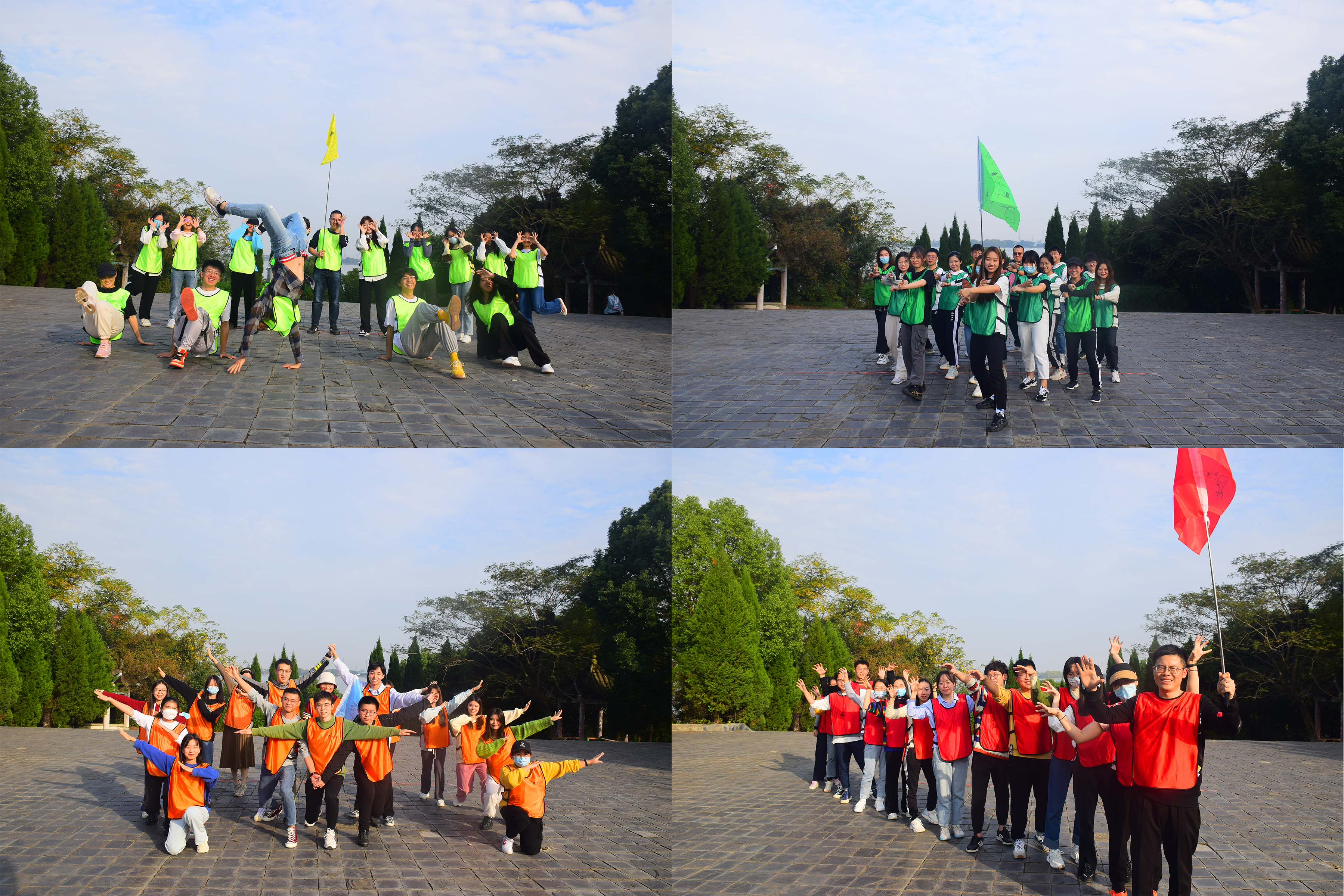 素拓活动正式开始,在教练的组织下同学们进行热身活动,并随机报号分成四支队伍,橙队“橘子汽水队”、绿队“忍者熊猫队”、黄队“好家伙队”、红队“街道口屠龙队”,四支队伍集思广益,各显神通,在队长的带领下进行了风采各异的队旗、口号创作与团队精神风貌展示。