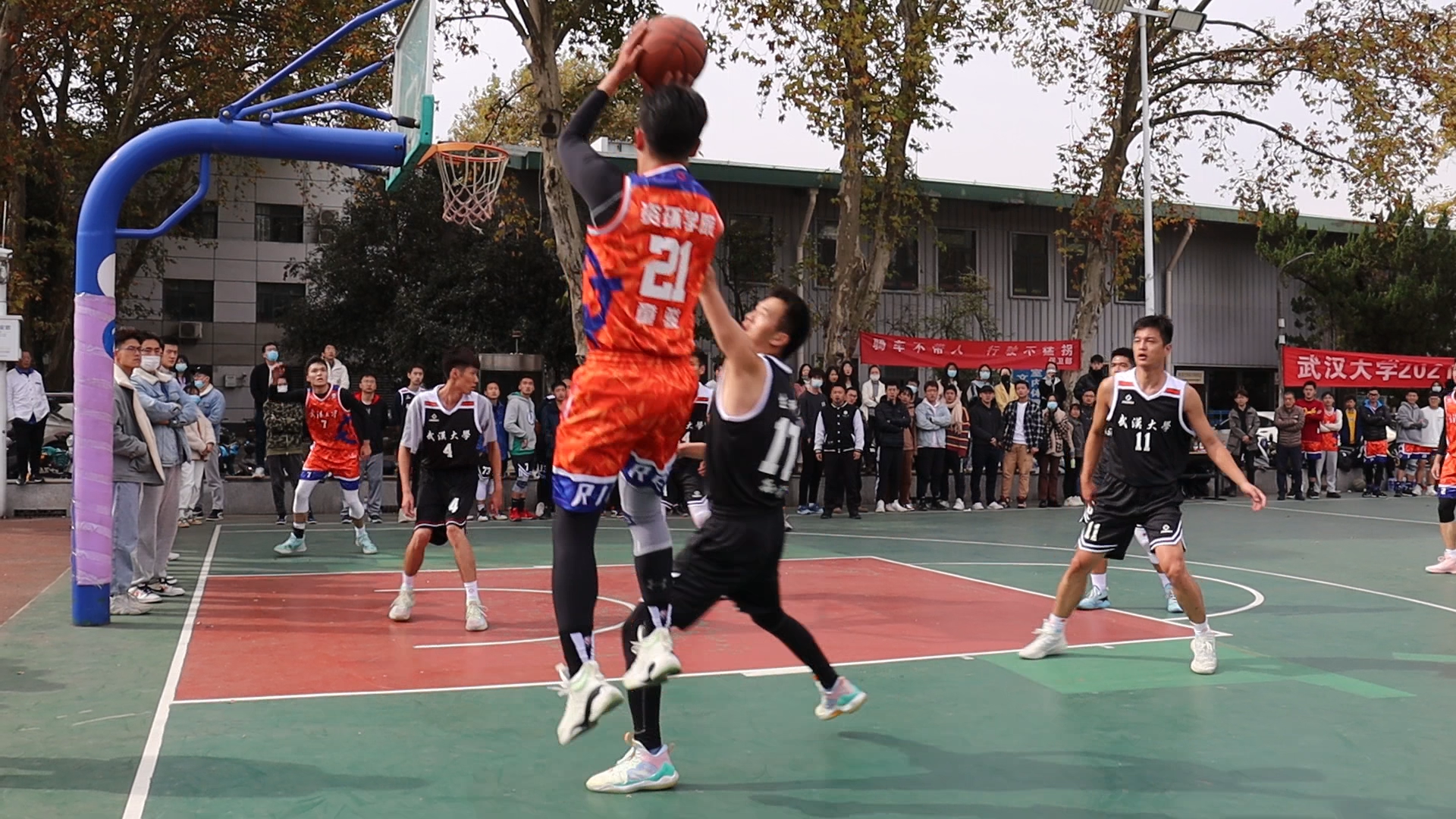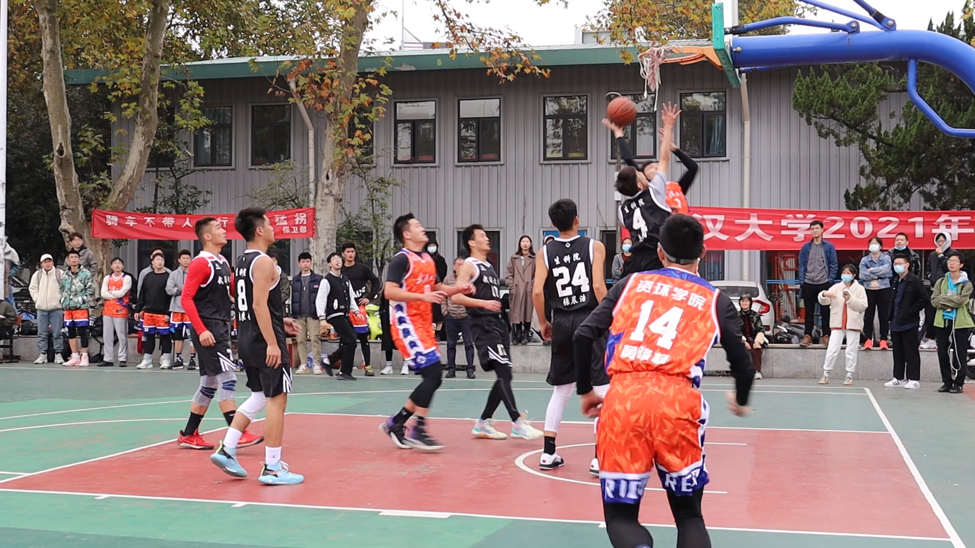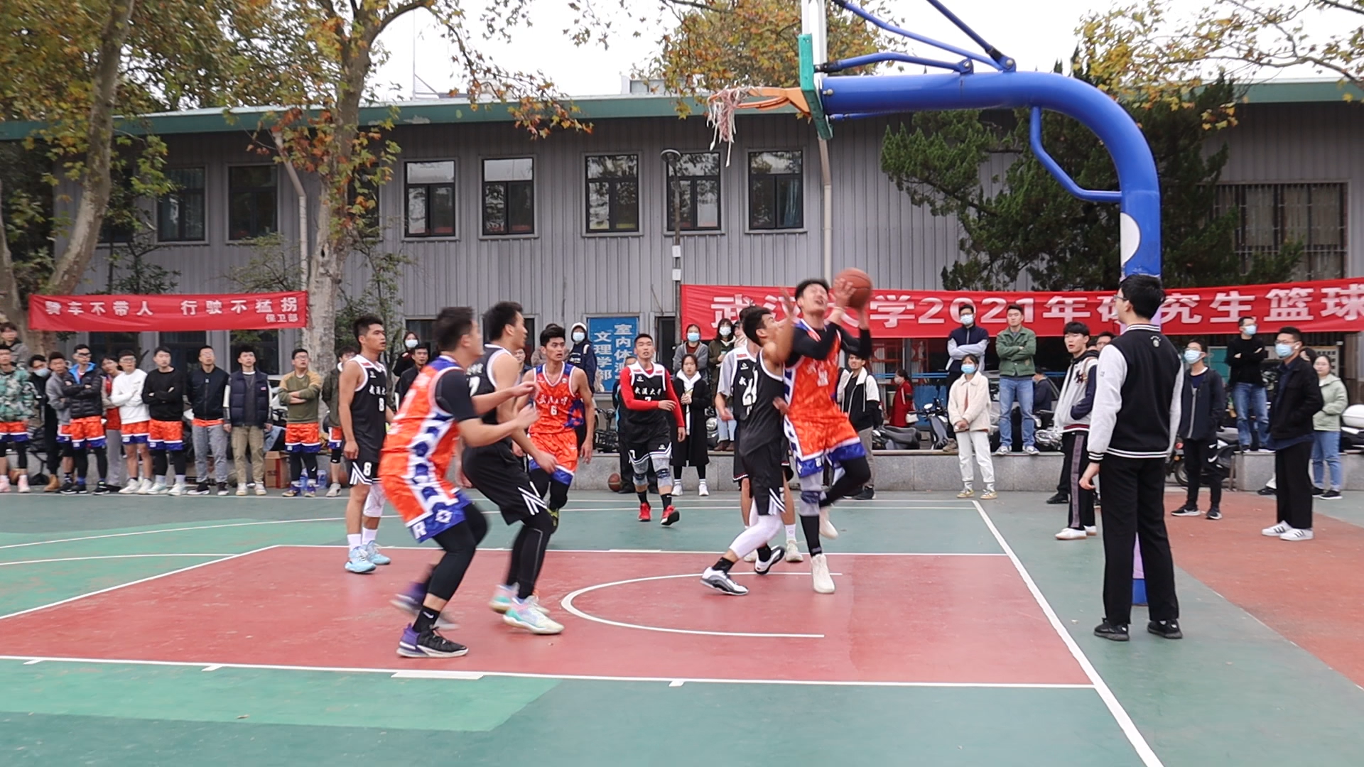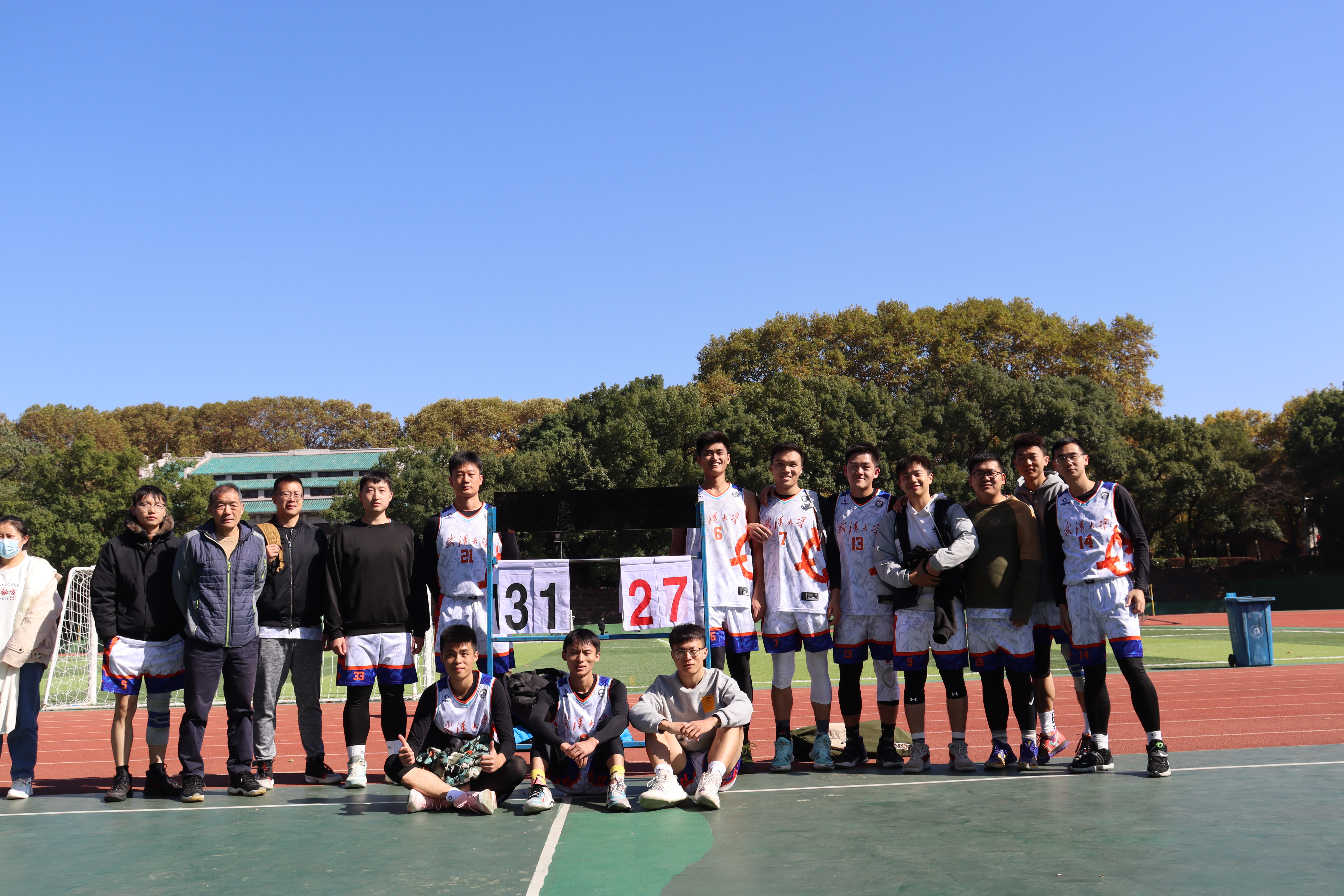 武汉大学2021年研究生篮球赛淘汰赛于11月8日在桂园操场举行。我院篮球队在面对电信学院的8强争夺战当中取得胜利,顺利挺进8强,并于9日在与生命科学学院的4强争夺战中取得胜利,进入半决赛。