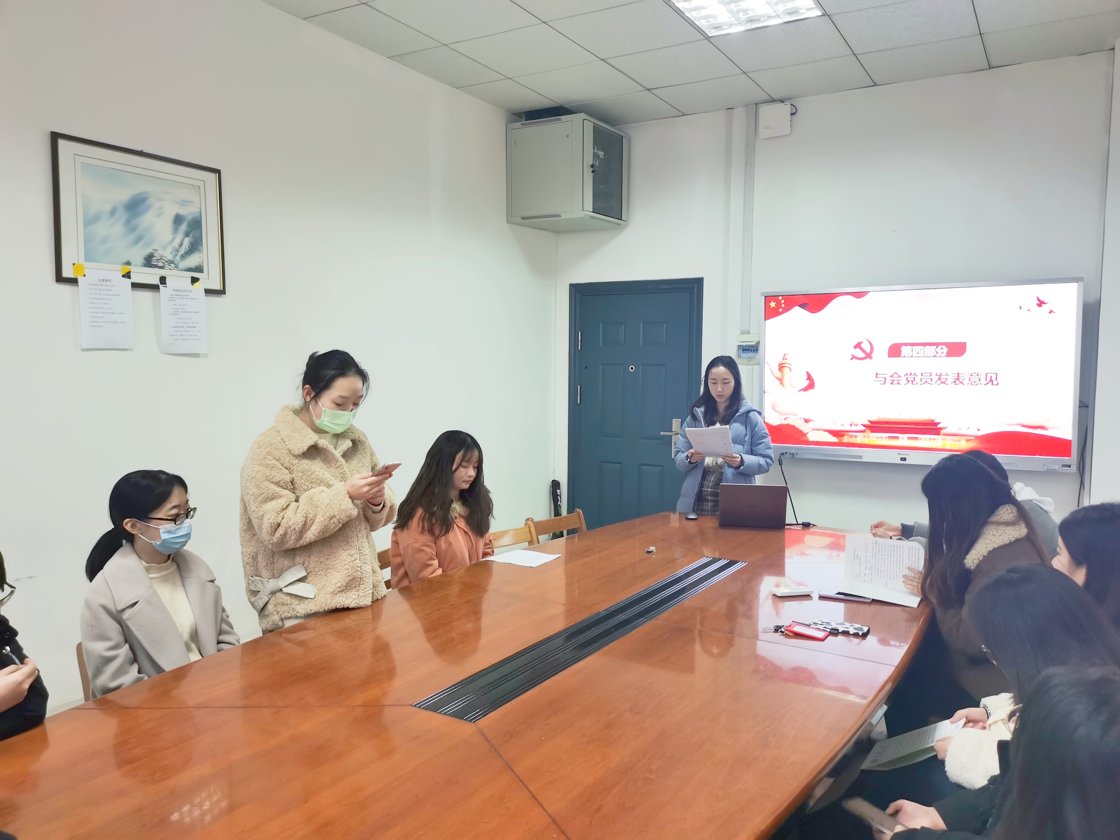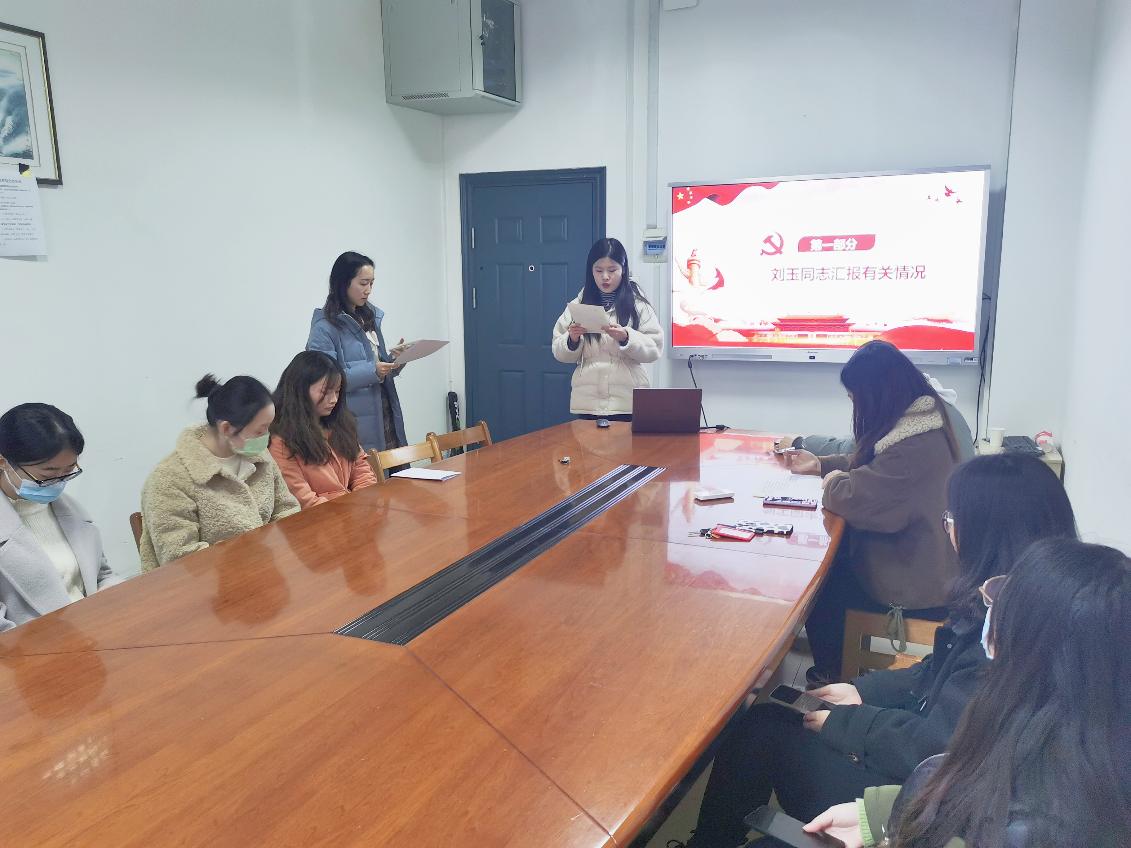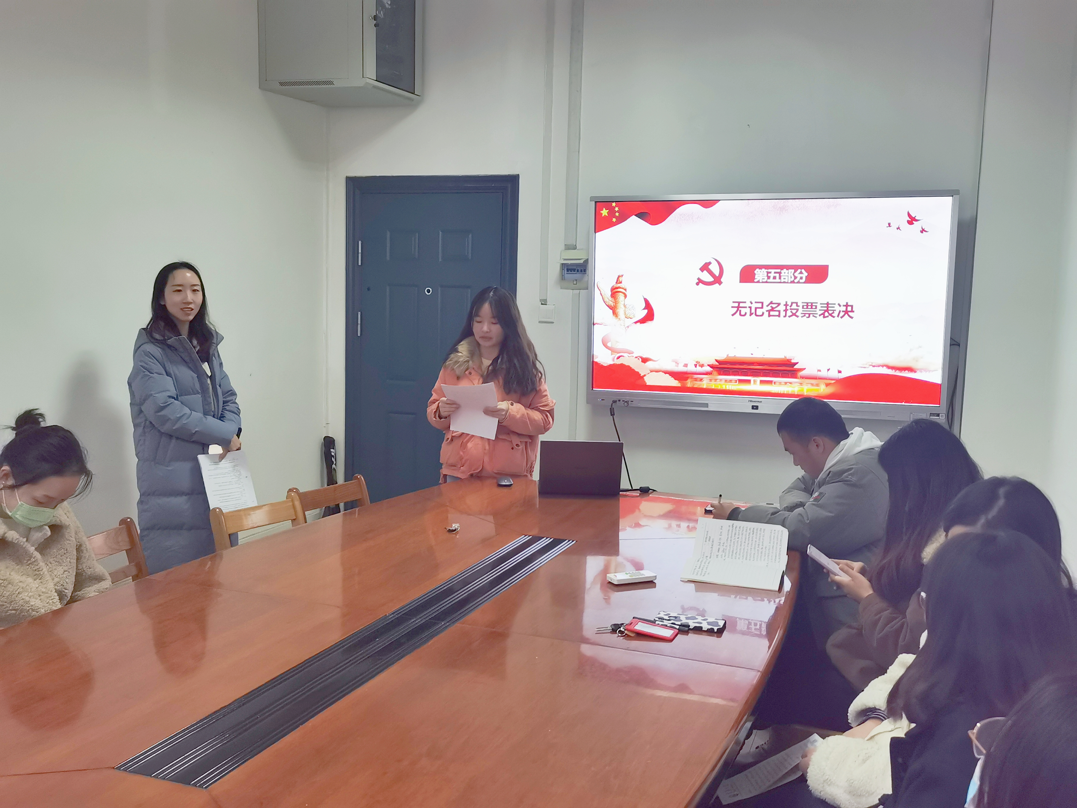 会议第二项,讨论刘玉同志的转正工作。首先由刘玉同志汇报自己在发展期间的思想认知、学习收获、在校表现等情况;支委会代表李启源同志向支部大会报告了刘玉同志预备期间积极上进的表现,认为其符合转正条件;经与会党员代表充分讨论与无记名投票,罗明霞同志宣布刘玉同志全票通过成为中共正式党员。最后,刘玉同志进行了表态,向党组织表达了自己的决心和信心。
