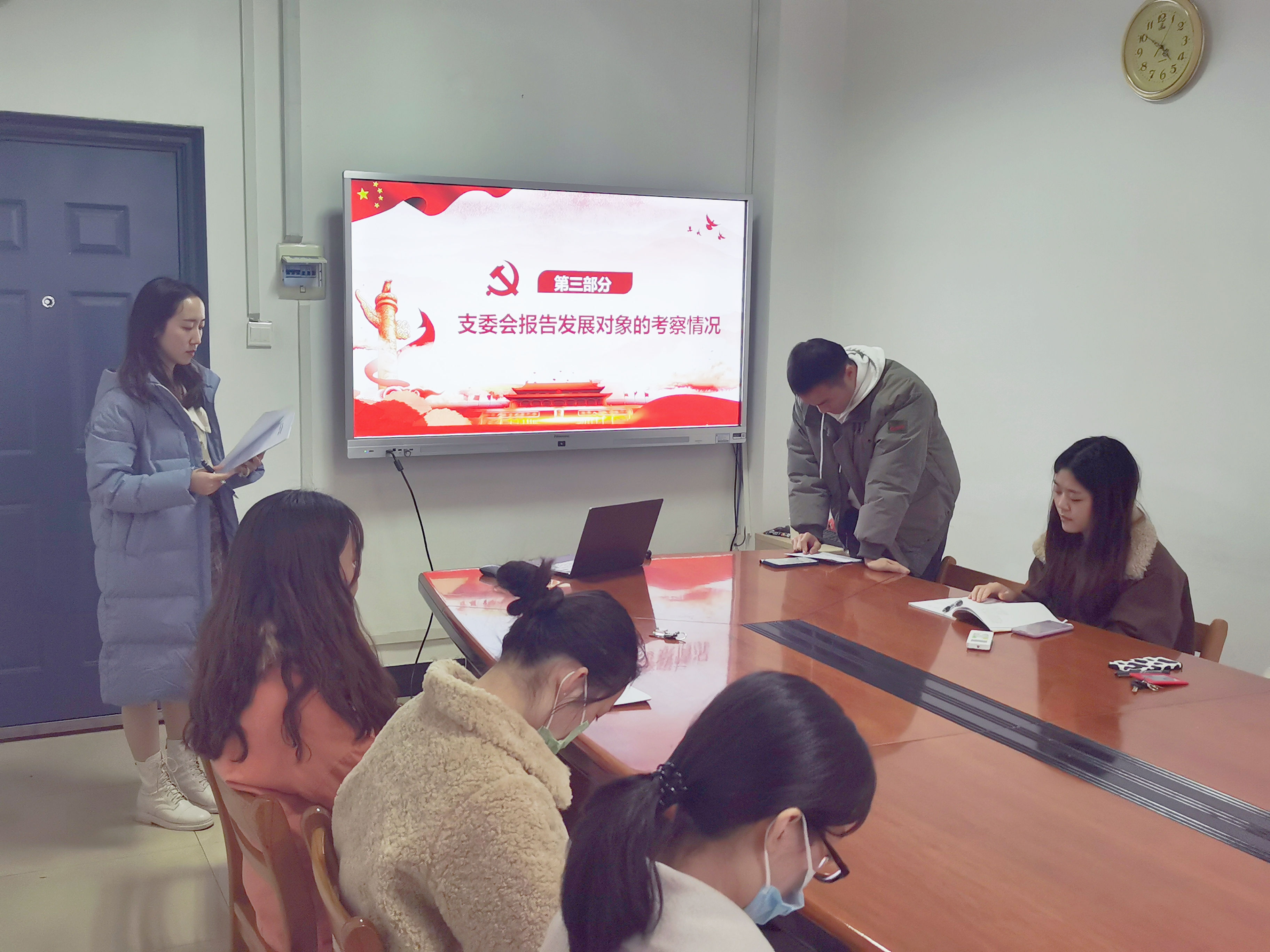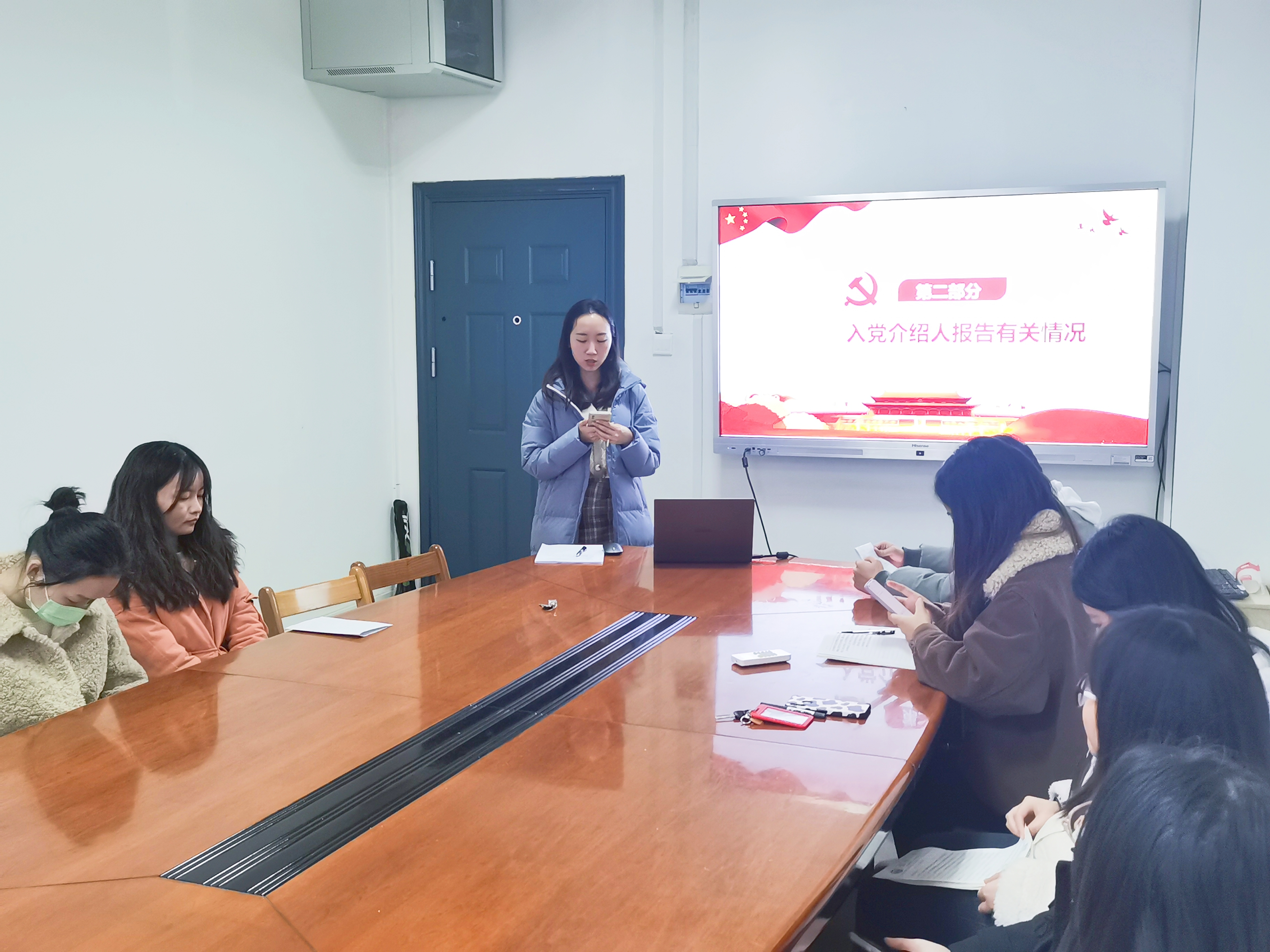 会议第一项,讨论接收曹敏雪同志为预备党员的工作。首先由曹敏雪同志汇报其对党的认识、入党动机和个人履历等情况;接着,入党介绍人谢璐励同志介绍发展对象有关情况;然后,支委会代表谢璐励向支部大会报告曹敏雪同志考察期间的积极表现,认为其符合共产党员的标准;经与会党员充分发表意见与不记名投票,书记罗明霞同志宣布曹敏雪同志全票通过接收成为中共预备党员。最后,曹敏雪同志做出了表态,向党组织表达了自身的想法与加入中国共产党的决心。