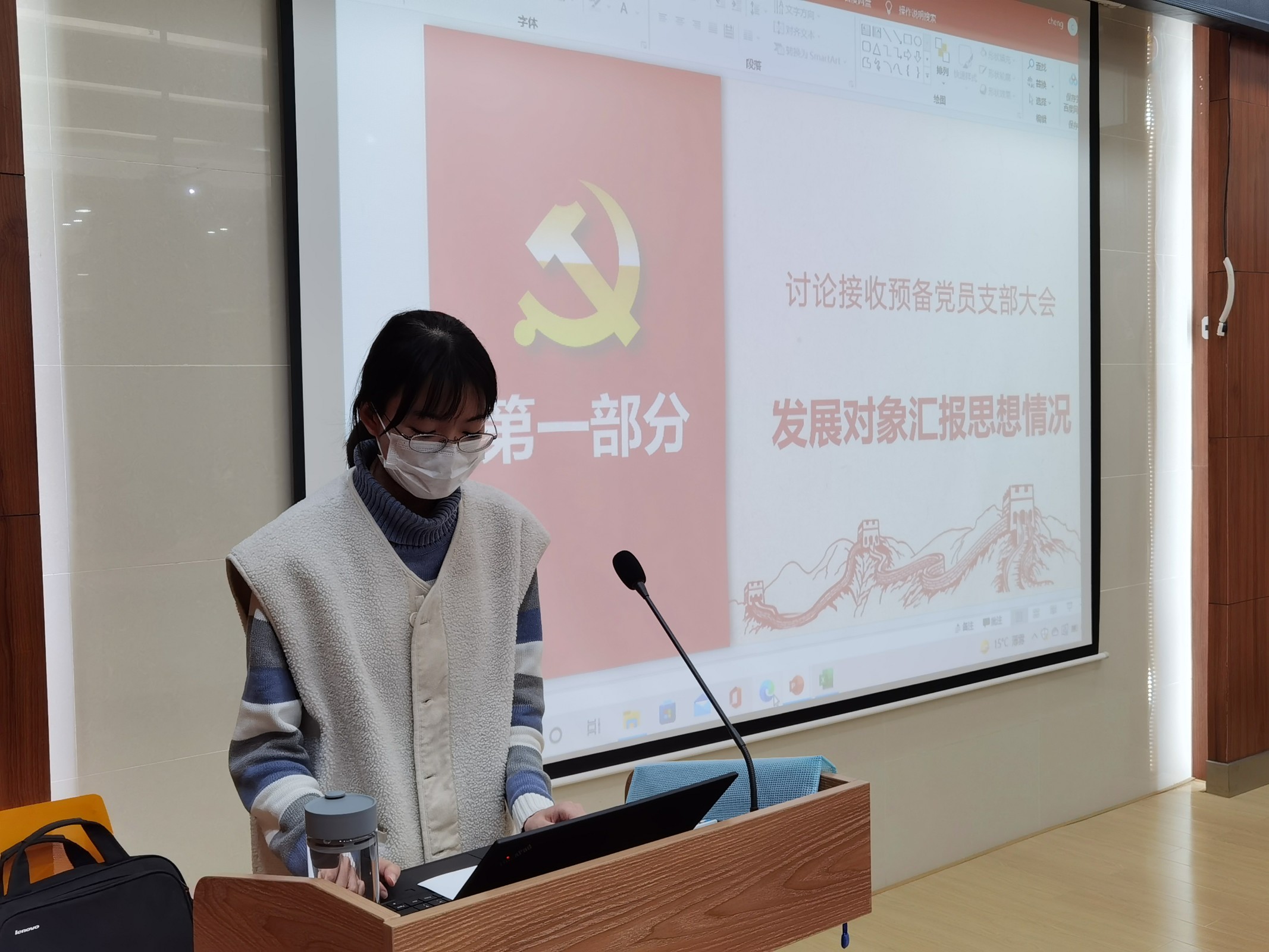 会议第一项,讨论接收侯美玲同志为预备党员。首先由侯美玲同志汇报其对党的认识、入党动机等思想状况;接着由两位培养考察人汇报对侯美玲同志的考察情况;然后,由支委会代表程鹏同志向支部大会报告对侯美玲同志的审查情况,认为其符合共产党员的标准;经与会党员充分发表意见与不记名投票,党支部书记程鹏同志宣布大会一致同意接收侯美玲同志成为中共预备党员;其后,侯美玲同志进行了表态,向党组织表达了自身的想法以及加入中国共产党的决心;最后,由党支部书记程鹏同志带领侯美玲同志进行入党宣誓。