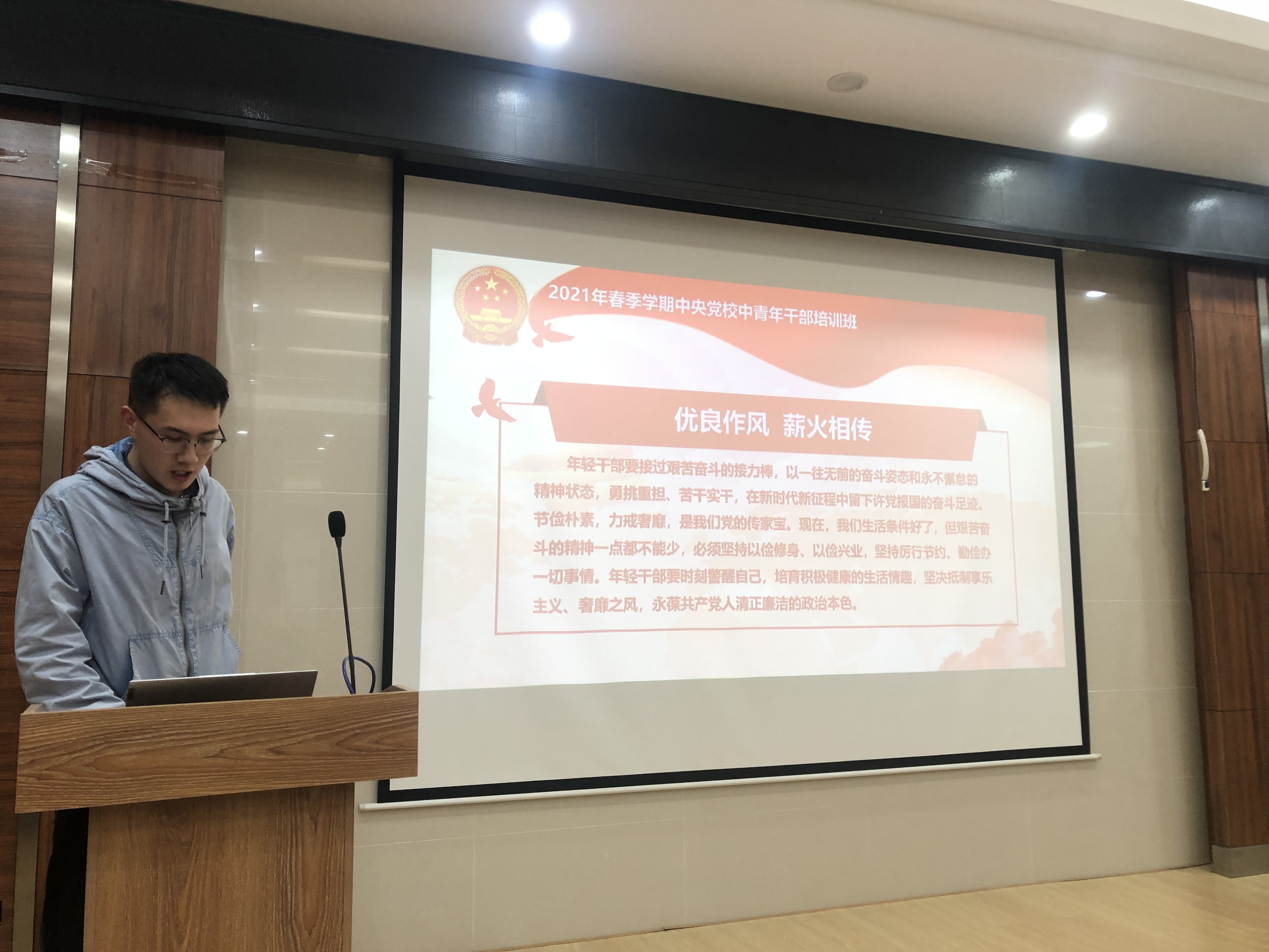 张铭浩同志围绕习近平在中央党校(国家行政学院)中青年干部培训班开班式上的重要讲话精神、习近平给全国高校黄大年式教师团队代表回信精神、习近平致新华社建社90周年的贺信展开介绍,强调作为新时代的青年,我们必须坚持以俭修身,继承并发扬艰苦奋斗的精神,永葆共产党人清正廉洁的政治本色。