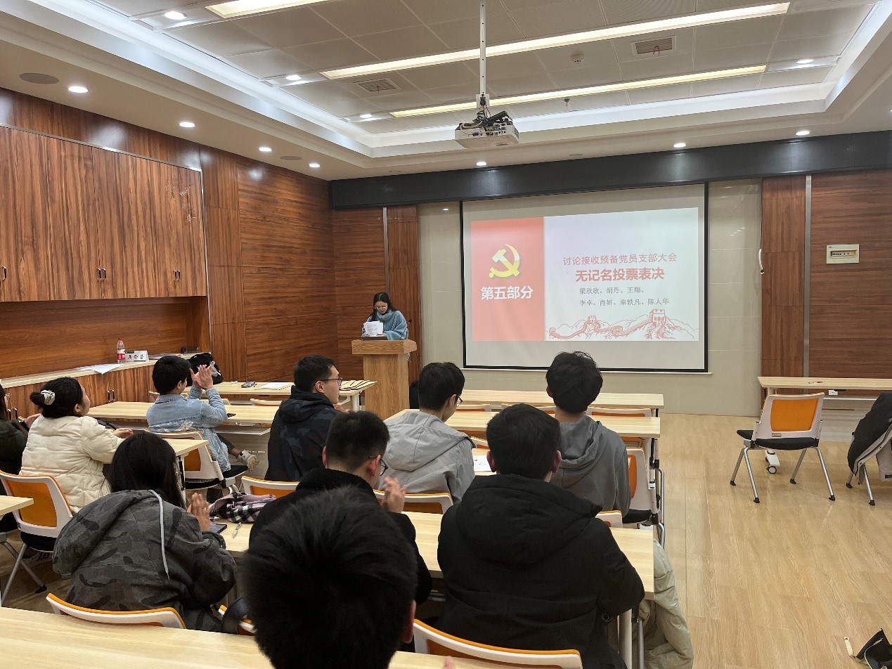 会议第一项,支部对接收梁欣欣、胡丹、王翔、李卓、肖妍、秦轶凡、陈人华同志为中共预备党员逐个进行讨论。首先,七位发展对象依次汇报了对党的认识、入党动机、个人基本情况等。随后,入党介绍人分别介绍相关情况,并对是否具备入党条件发表意见。然后,党支部书记汤慧玲同志代表支部委员会报告审查情况。紧接着,与会党员发表意见,正式党员进行无记名投票,对七名同志的赞成人数均超过应到会有表决权的正式党员的半数,同意接收其为预备党员。