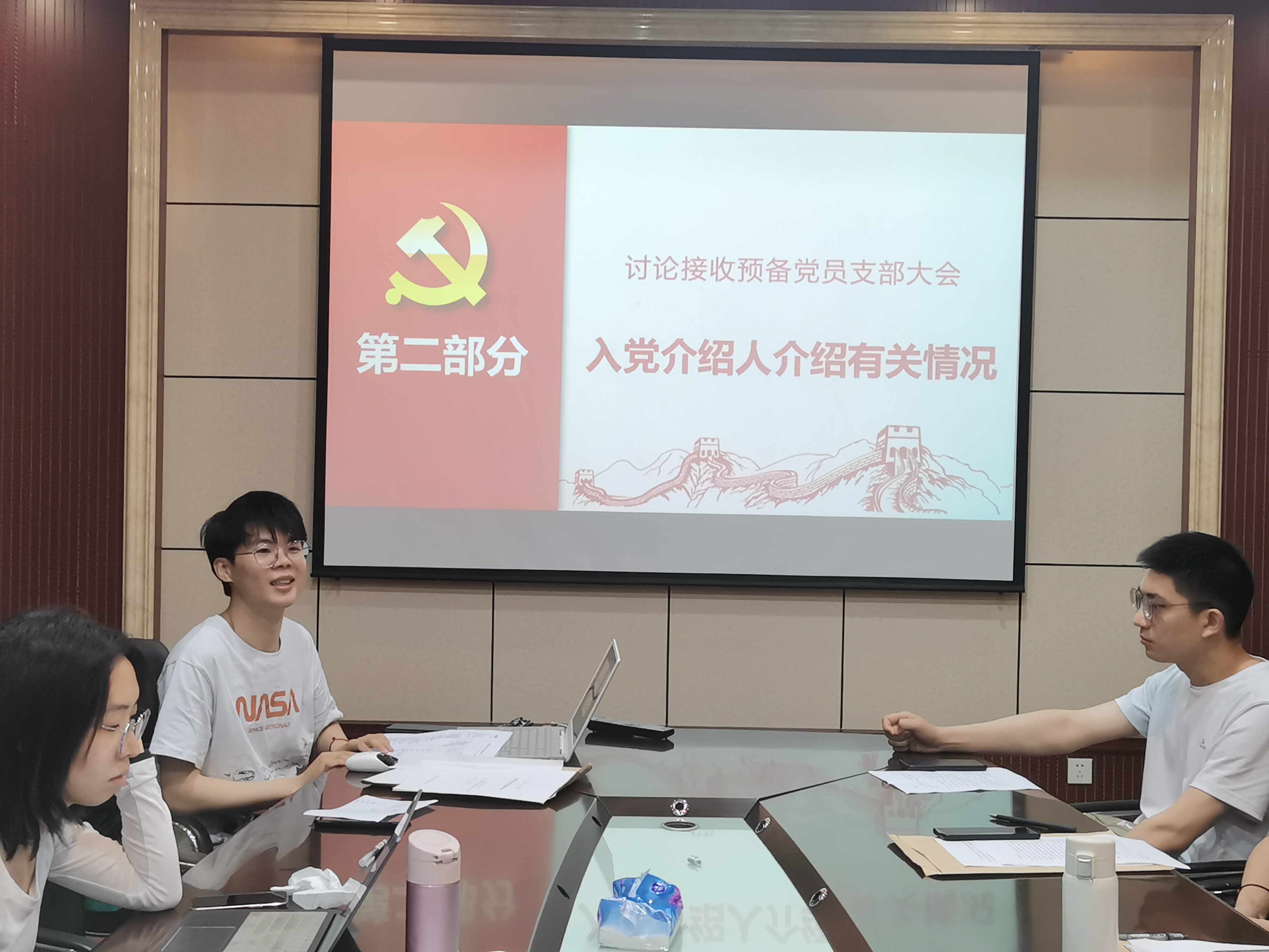 会议第二项,逐个讨论预备党员李昊、傅成翀、赵雨诗、张静贤、翦英豪共五名同志的转正申请。首先,由预备党员李昊、傅成翀、赵雨诗、张静贤、翦英豪分别向党支部汇报在预备期内的思想情况,介绍了科研学习和生活上的表现并进行总结与反思。由培养考察人汇报考察情况,与会正式党员发表意见,对五名同志的表现给予肯定。随后由正式党员进行无记名投票,同意23票,反对0票,弃权0票。由党支部书记苏会钰宣读大会决议,同意李昊、傅成翀、赵雨诗、张静贤、翦英豪同志的转正申请,如期转为中共正式党员。由苏会钰同志带领大家宣读了入党誓词。