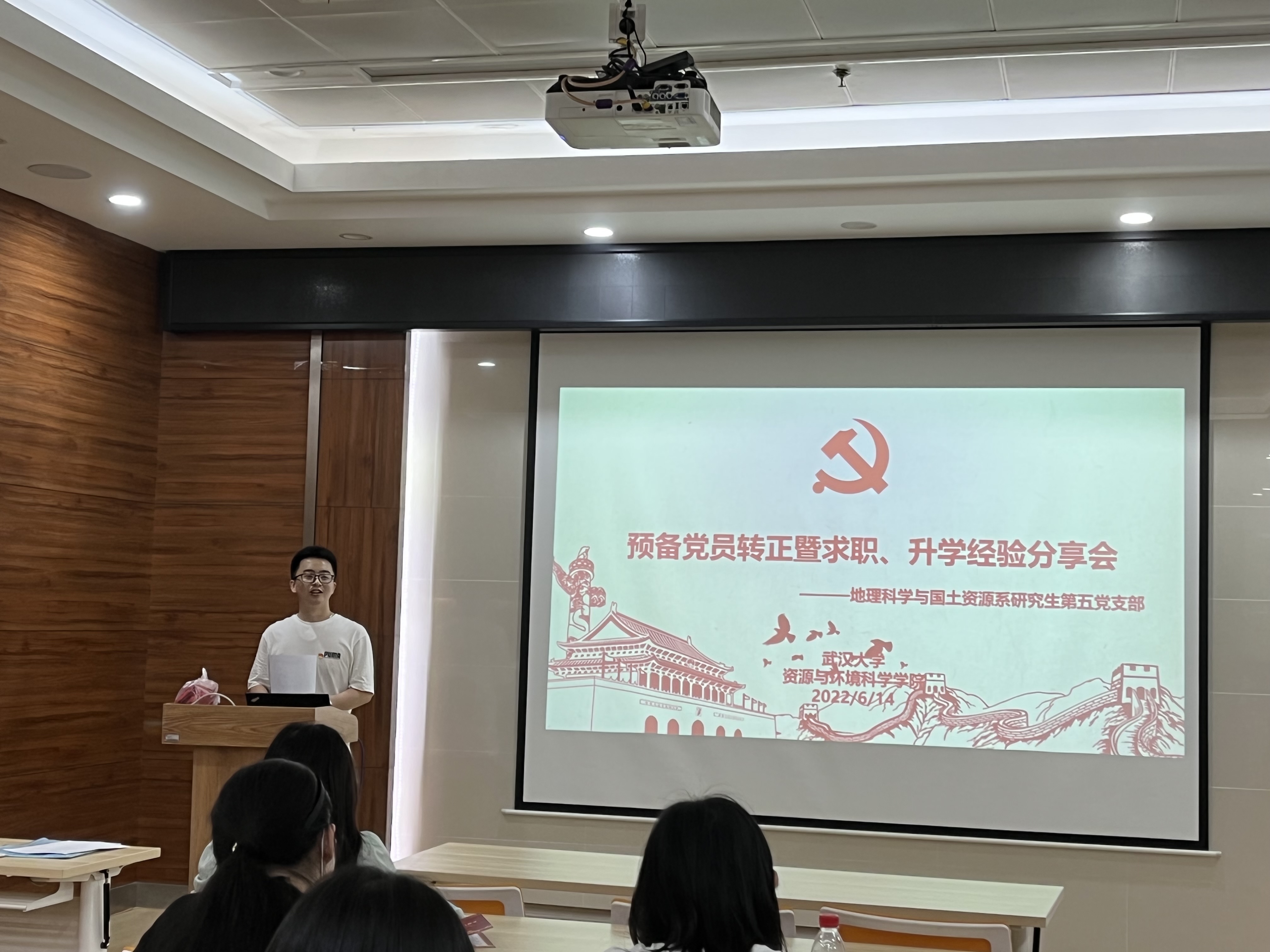 2022年6月14日晚19:00,地理科学与国土资源系研究生第五党支部于电脑城429会议室召开预备党员转正大会暨经验分享活动。本次会议由党支部书记程鹏同志主持,主要包括讨论预备党员蒋江俊男同志转正、政治生日活动、支部委员会调整以及求职、升学等经验分享四项议程。