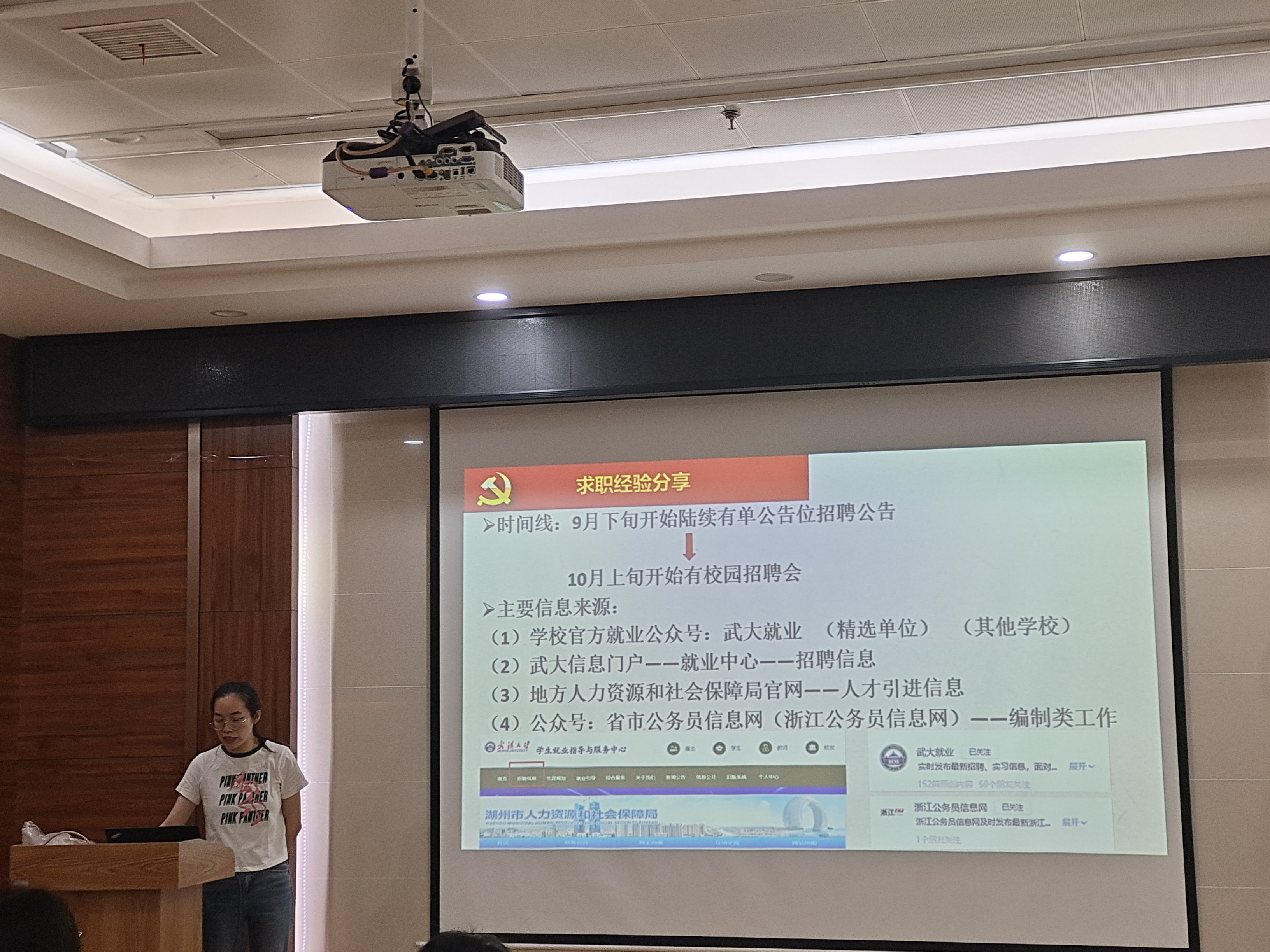 会议第四项,党支部同志的求职、升学等经验分享。首先,分别由测绘工程专业朱丽芳、土地资源管理专业府梦雪、人文地理专业王诗琪三位同志带来求职经验分享。三位同志就自己的求职经历、求职过程的经验教训、求职规划、求职建议等多方面向大家分享,不仅为明年毕业的同志在求职方面“排雷避坑”,而且让大家对毕业去向和选择有了更加清晰的了解和认知。