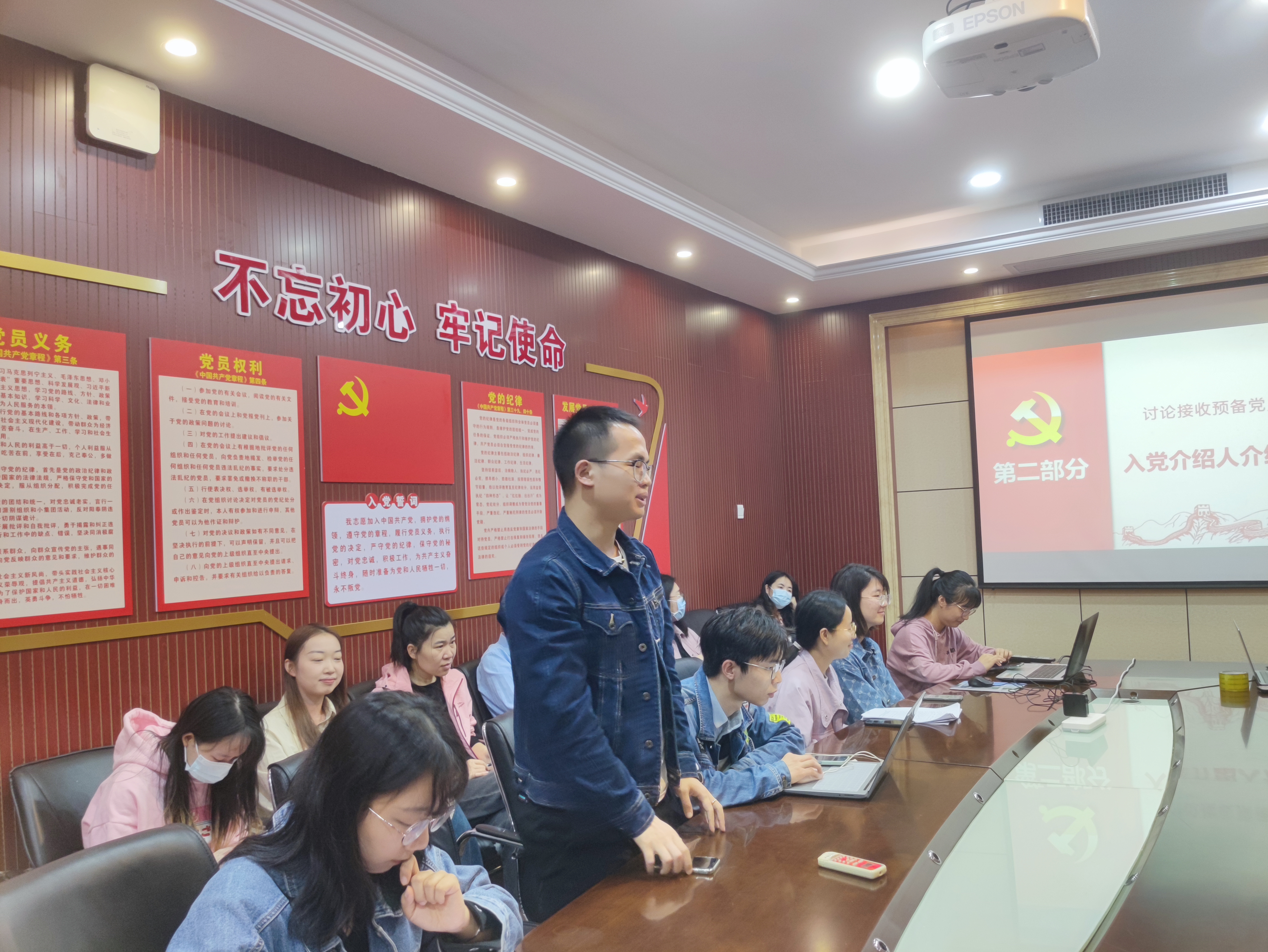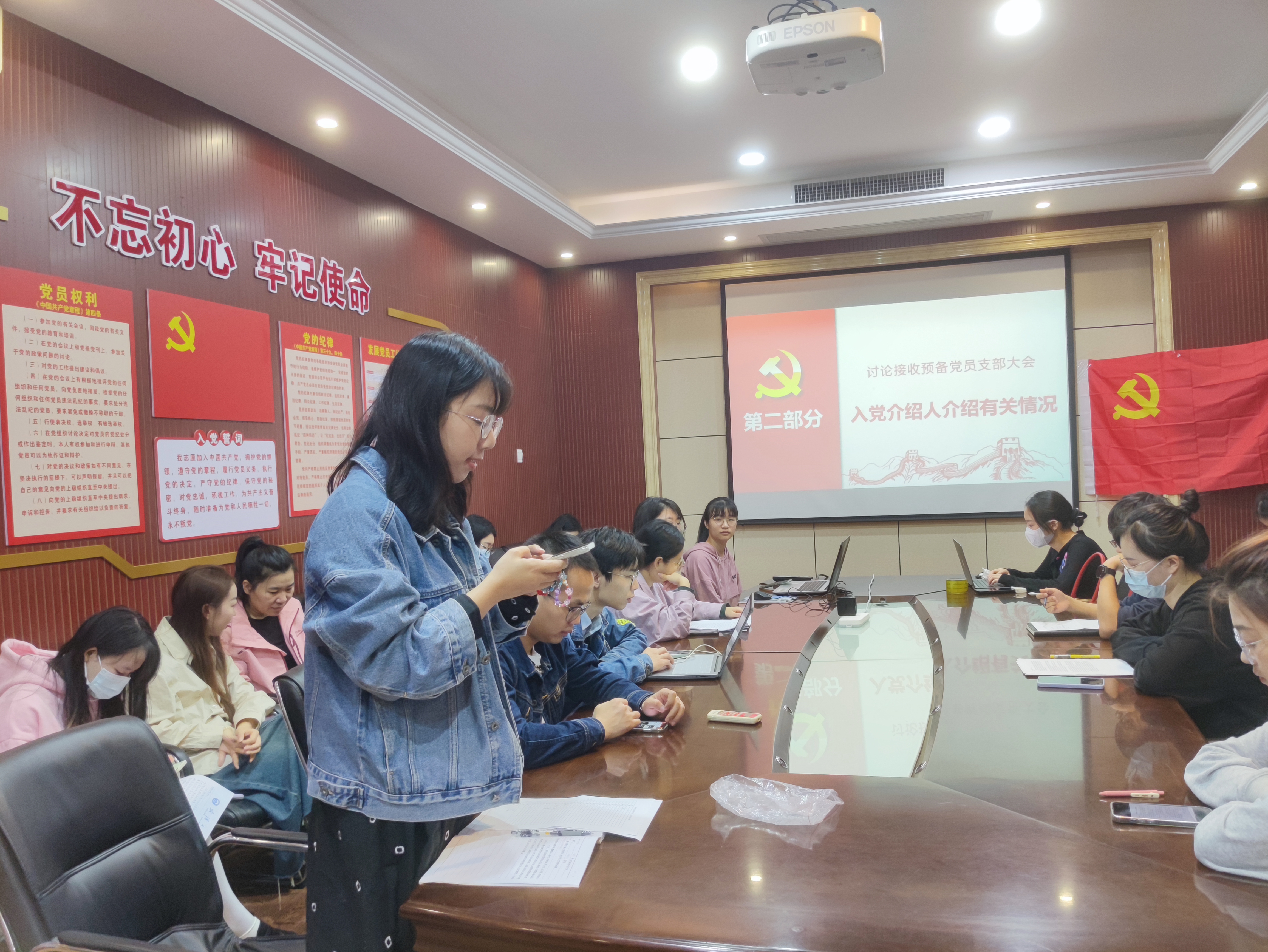 会议第一项,讨论接收黄伊琳,冯文佩,赵忠涛同志为中共预备党员。首先,三名同志分别就自身情况、入党动机、思想状况、学习情况等向党组织进行了汇报。接下来,依次由入党介绍人介绍有关情况:三名同志在政治思想和学习生活中均积极向党组织靠拢,符合党员标准。胡慧同志代表支委会报告审查情况:黄伊琳,冯文佩和赵忠涛同志发展流程规范,政审合格,均符合入党条件。随后,与会党员发表意见,对三名同志的表现给予肯定。