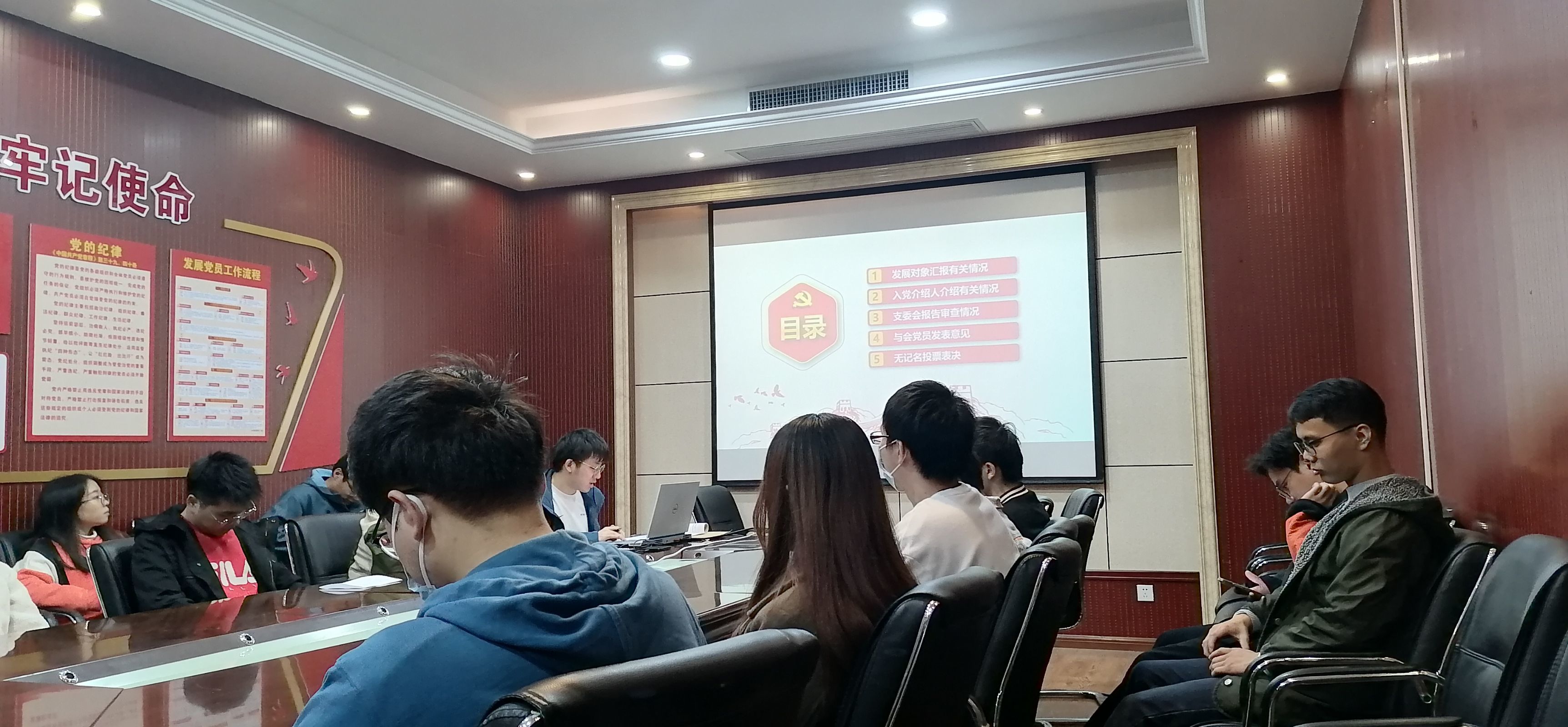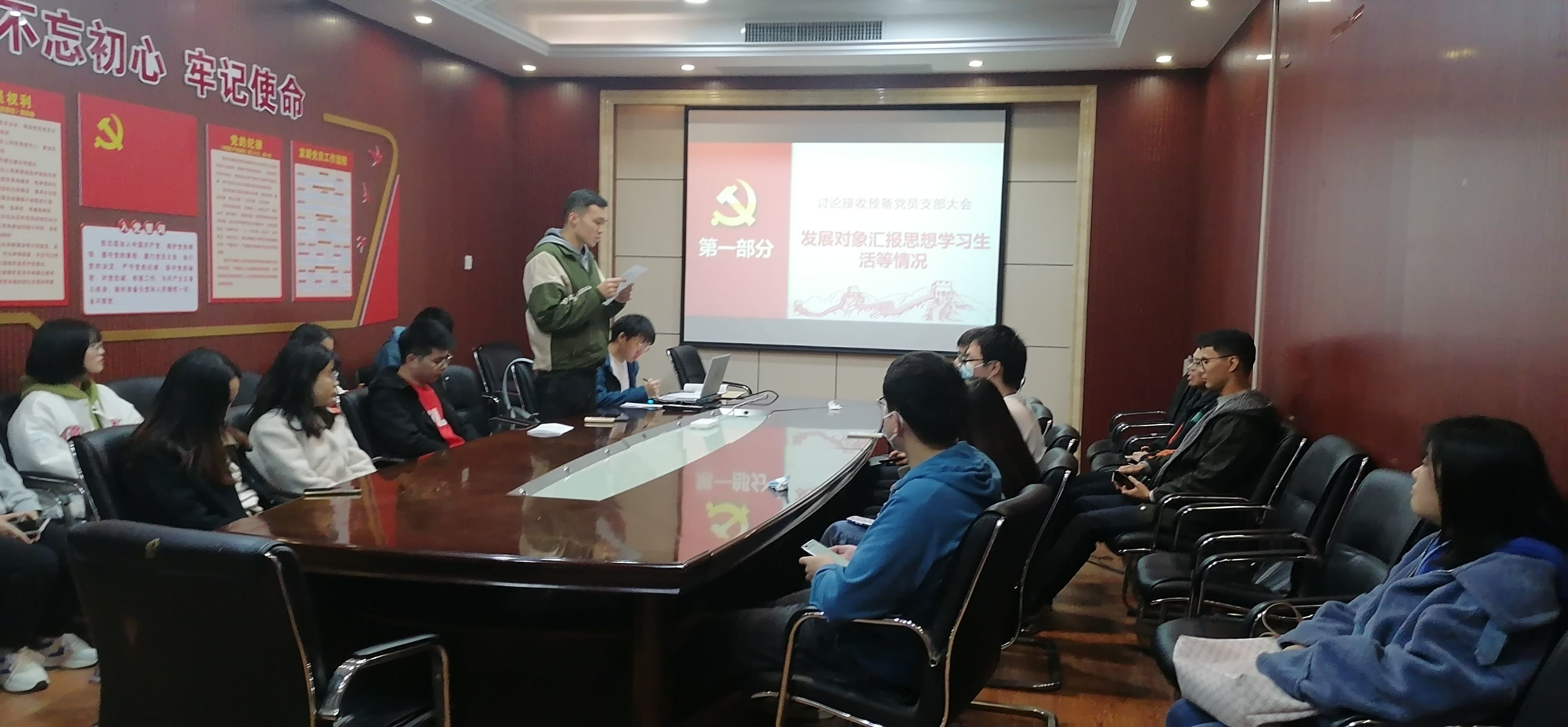 会议开始,由支部书记邹仁伟同志对本次会议的基本内容进行了介绍,主要为讨论朱俊杰同志与赵炜同志的预备党员接收。首先,朱俊杰同志与赵炜同志向组织汇报了自己在预备期间的工作学习情况,阐述了个人思想认识等方面的进步,表达了自身的发展意愿。