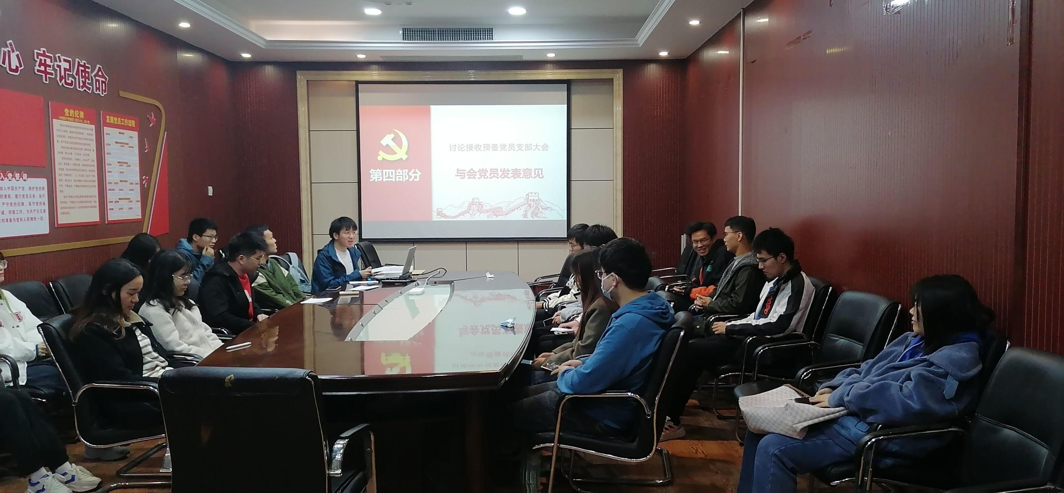 2022年11月16日地理信息与地图科学系研究生第五党支部于开云官方.中国504会议室召开接收预备党员支部大会。本次会议由支部书记邹仁伟同志主持,主要内容包括对朱俊杰同志与赵炜同志的预备党员接收讨论。本次会议应到正式党员及预备党员28人,实到参会党员20人,发展对象与入党积极分子也参与了会议。
