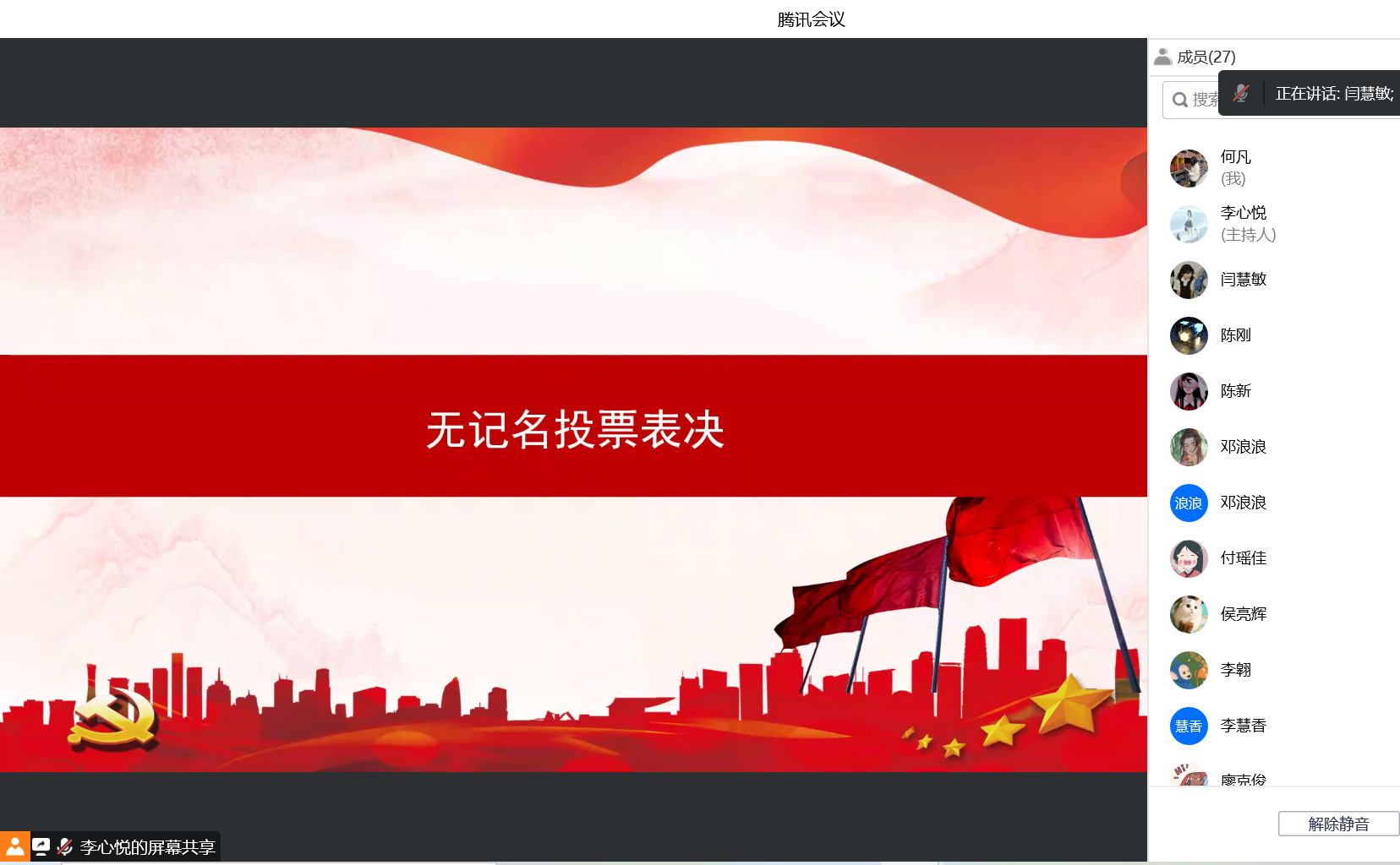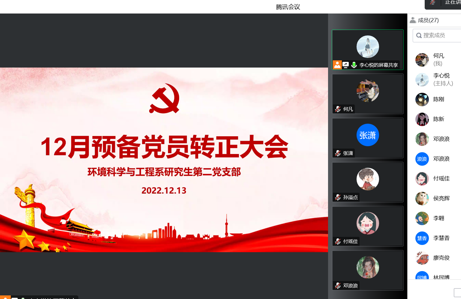 2022年12月13日19:30,环境科学与工程系研究生第二党支部召开预备党员转正大会,受疫情影响会议采用线上腾讯会议形式进行。本次会议应到正式党员20名、预备党员6名,因事、因病请假0名,实到会正式党员20名、预备党员6名,有表决权的到会人数超过应到会有表决权人数的半数,符合规定人数。