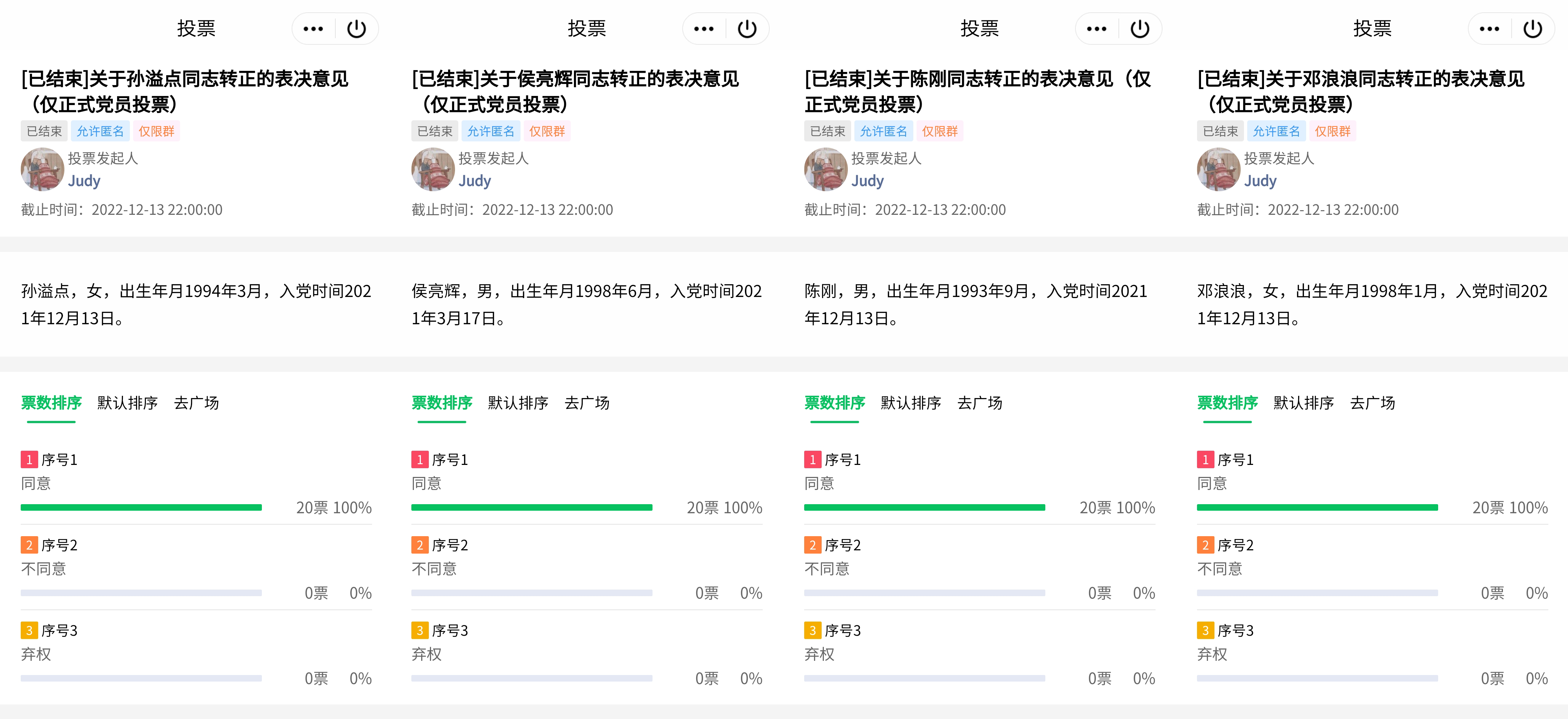 会议第四项,讨论预备党员邓浪浪同志的转正问题。首先由邓浪浪同志汇报了其预备期间的思想、工作情况,其第一考察人申振玲和第二考察人周奉对其预备期的表现进行评价,党支部书记何凡同志代表支部委员会报告该同志在预备期间的教育考察情况,与会党员对邓浪浪同志在预备期间的各方面情况表示肯定。经过无记名投票,表决结果为:邓浪浪同志得赞成票20张,不赞成票0张,弃权票0张,对邓浪浪同志的赞成人数超过应到会有表决权的正式党员的半数,同意其按期转为中共正式党员。