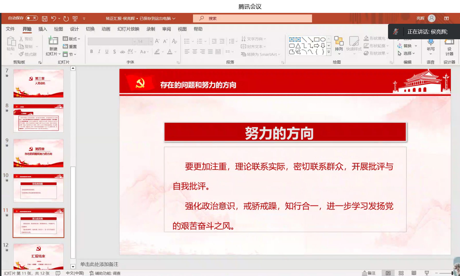 会议第二项,讨论预备党员侯亮辉同志的转正问题。首先由侯亮辉同志汇报了其预备期间的思想、工作情况,其第一考察人廖克俊和第二考察人佘思佳对其预备期的表现进行评价,党支部书记何凡同志代表支部委员会报告该同志在预备期间的教育考察情况,与会党员对侯亮辉同志在预备期间的各方面情况表示肯定。经过无记名投票,表决结果为:侯亮辉同志得赞成票20张,不赞成票0张,弃权票0张,对侯亮辉同志的赞成人数超过应到会有表决权的正式党员的半数,同意其按期转为中共正式党员。