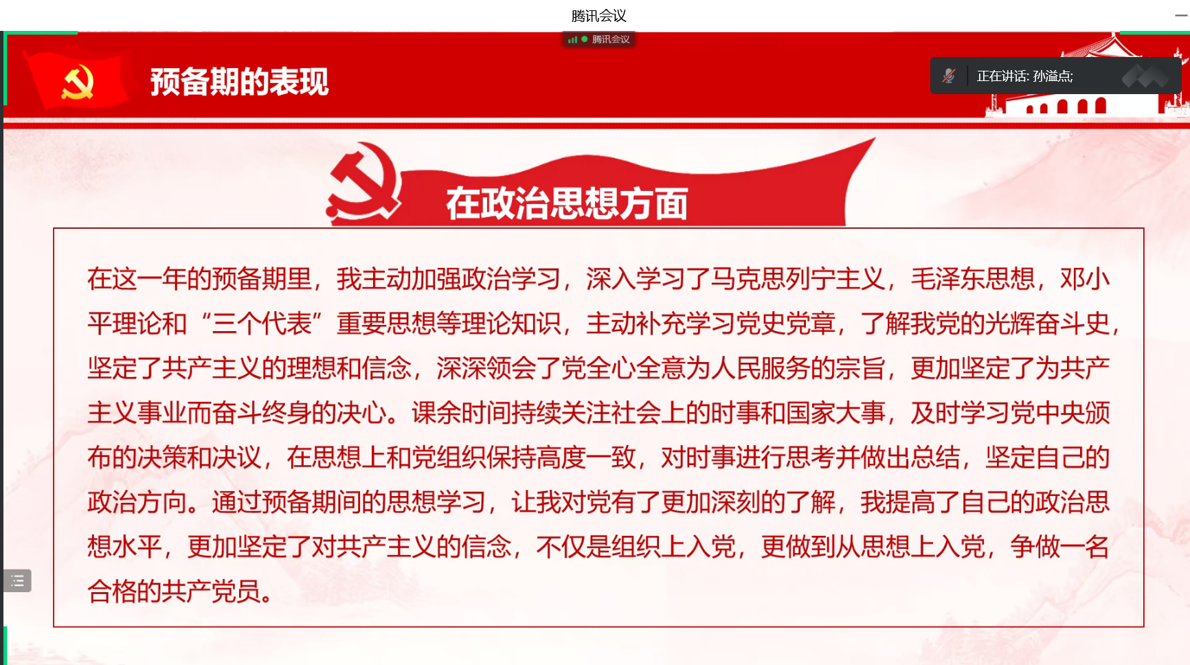 会议第一项,讨论预备党员孙溢点同志的转正问题。首先由孙溢点同志汇报了其预备期间的思想、工作情况,其第一考察人刘馨和第二考察人周奉对其预备期的表现进行评价,党支部书记何凡同志代表支部委员会报告该同志在预备期间的教育考察情况,与会党员对孙溢点同志在预备期间的各方面情况予以肯定。经支部委员会研究和全体党员审议,确定陈新、闫慧敏同志为监票人和计票人。经过无记名投票,表决结果为:孙溢点同志得赞成票20张,不赞成票0张,弃权票0张,对孙溢点同志的赞成人数超过应到会有表决权的正式党员的半数,同意其按期转为中共正式党员。