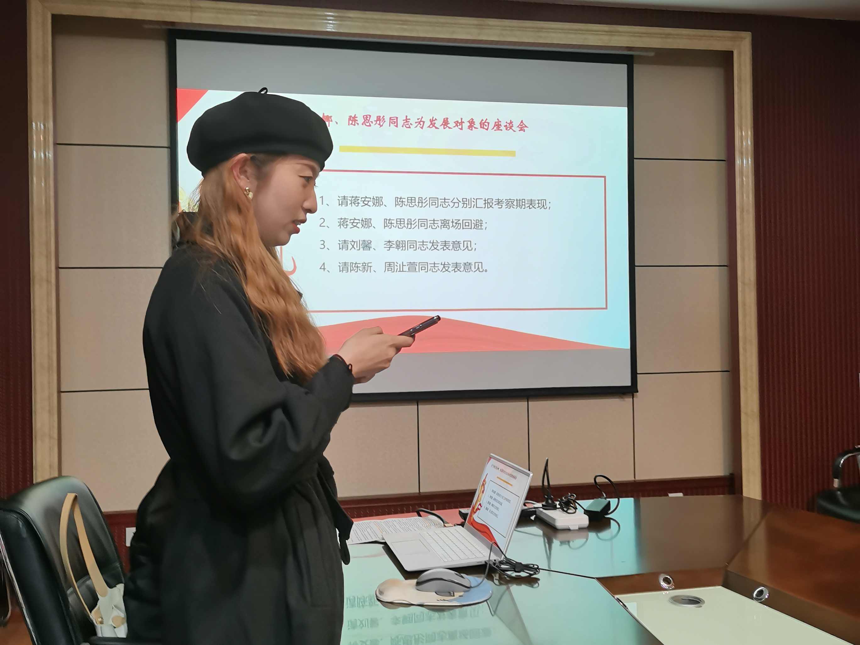会议第三项,听取党员和群众对于确定蒋安娜、陈思彤同志为发展对象的意见。蒋安娜、陈思彤同志汇报个人情况后回避离场,支部同志们展开广泛交流。刘馨和李翱同志对蒋安娜同志的现实表现予以肯定,同时建议其平衡好科研与生活的关系。陈新和周沚萱同志赞扬了陈思彤同志在过去一年的显著进步,也希望其提高自身情绪管理能力。经支部充分讨论,一致认为蒋安娜和陈思彤同志表现优异,达到了发展对象的条件与要求。
