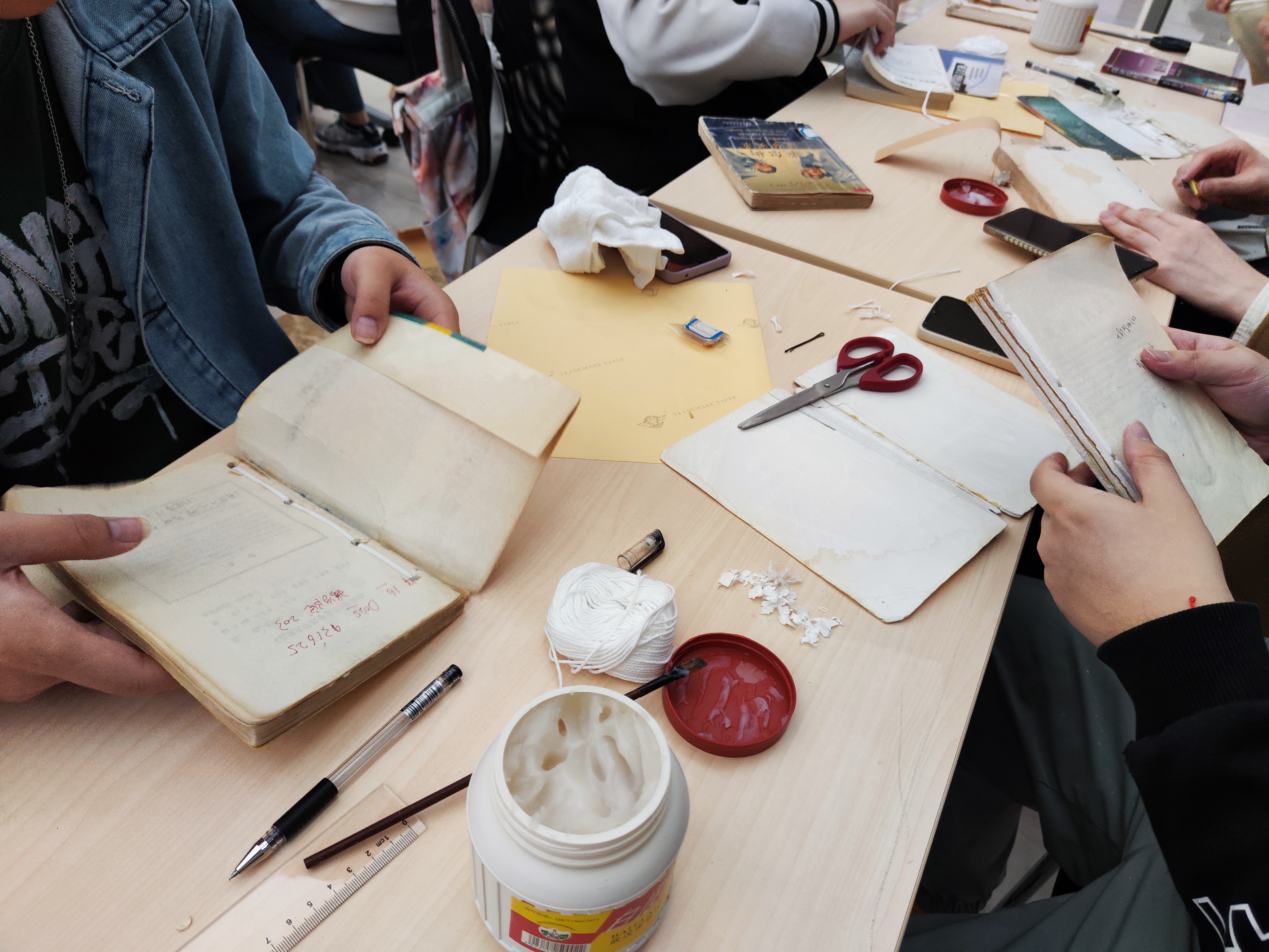 活动伊始,学校修书志愿队的同学对支部成员关于修书流程进行了细致且耐心的讲解。对于一本破损的图书,首先需要用线将其进行装订,然后用小刀刮去脱落的书皮上的毛边与纸屑,最后用浆糊将脱落的书皮与图书主体的书脊进行粘合。对于破损较为严重的书皮,还需要使用牛皮纸进行接补后再与书脊进行粘合。