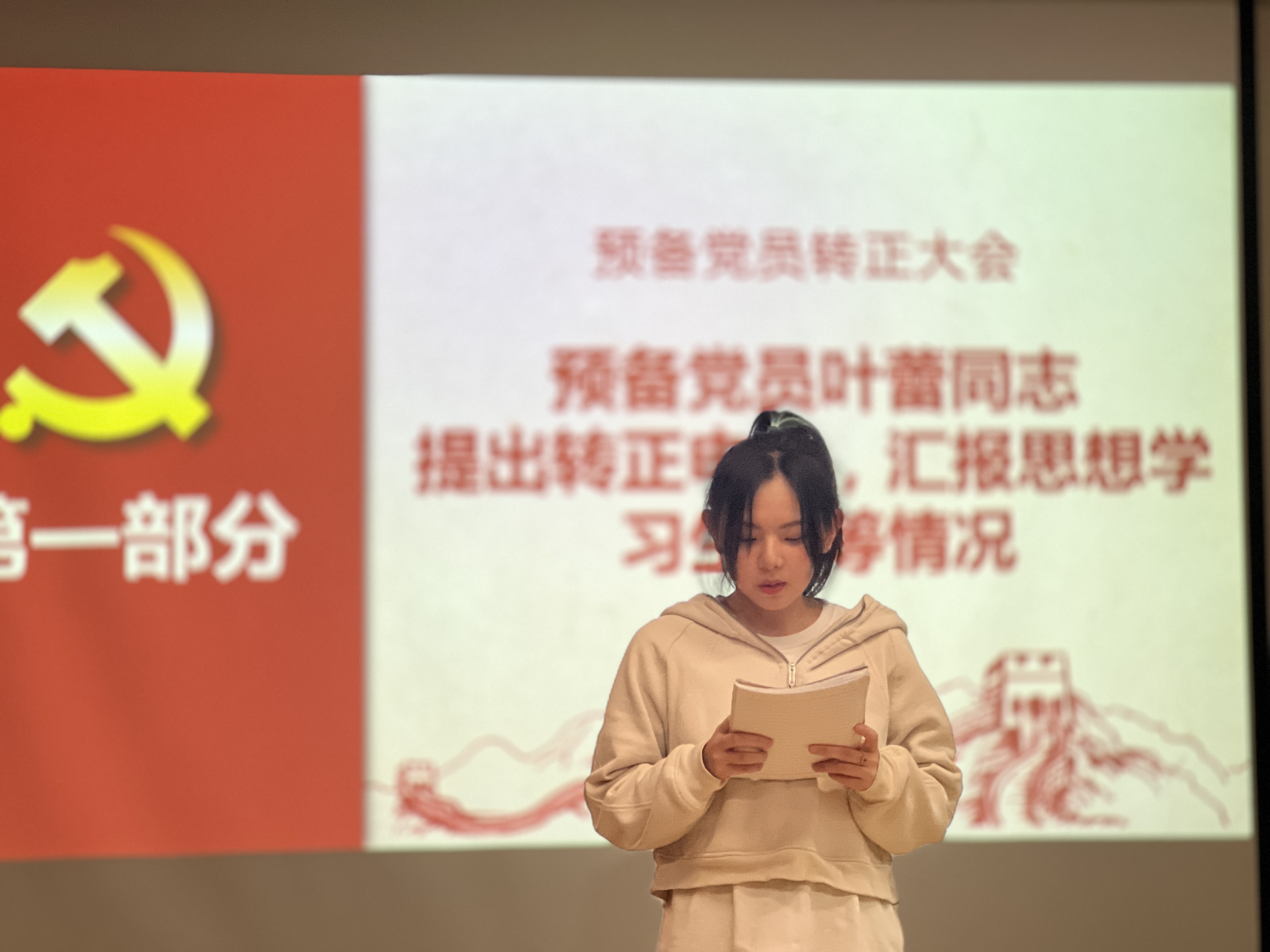 会议第五项,讨论叶蕾同志的转正工作。首先由叶蕾同志汇报预备期间的思想和工作情况;之后由支部委员会报告叶蕾同志预备期间的教育考察情况。与会党员张梦同志对叶蕾同志预备期间的各方面表现予以肯定。经过有表决权的正式党员进行无记名投票,本次大会表决结果为:叶蕾同志得赞成票23张,不赞成票0张,弃权票0张,同意其按期转正为中共正式党员。最后,叶蕾同志进行表态,向党组织表明了自己的决心和信心。