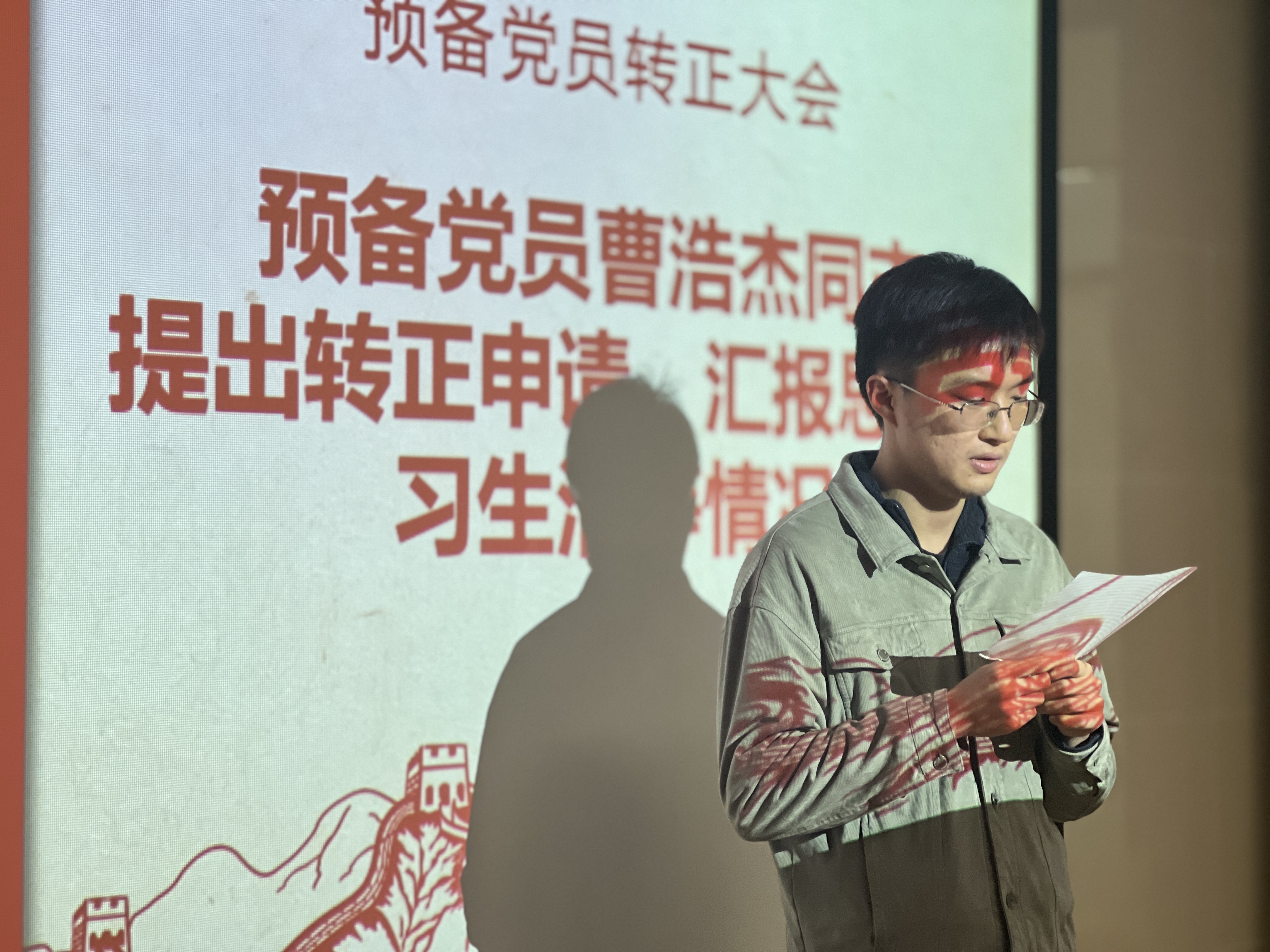 会议第三项,讨论曹浩杰同志的转正工作。首先由曹浩杰同志汇报预备期间的思想和工作情况;之后由支部委员会报告曹浩杰同志预备期间的教育考察情况。经过有表决权的正式党员进行无记名投票,本次大会表决结果为:曹浩杰同志得赞成票23张,不赞成票0张,弃权票0张,同意其按期转正为中共正式党员。最后,曹浩杰同志进行表态,向党组织表明了自己的决心和信心。