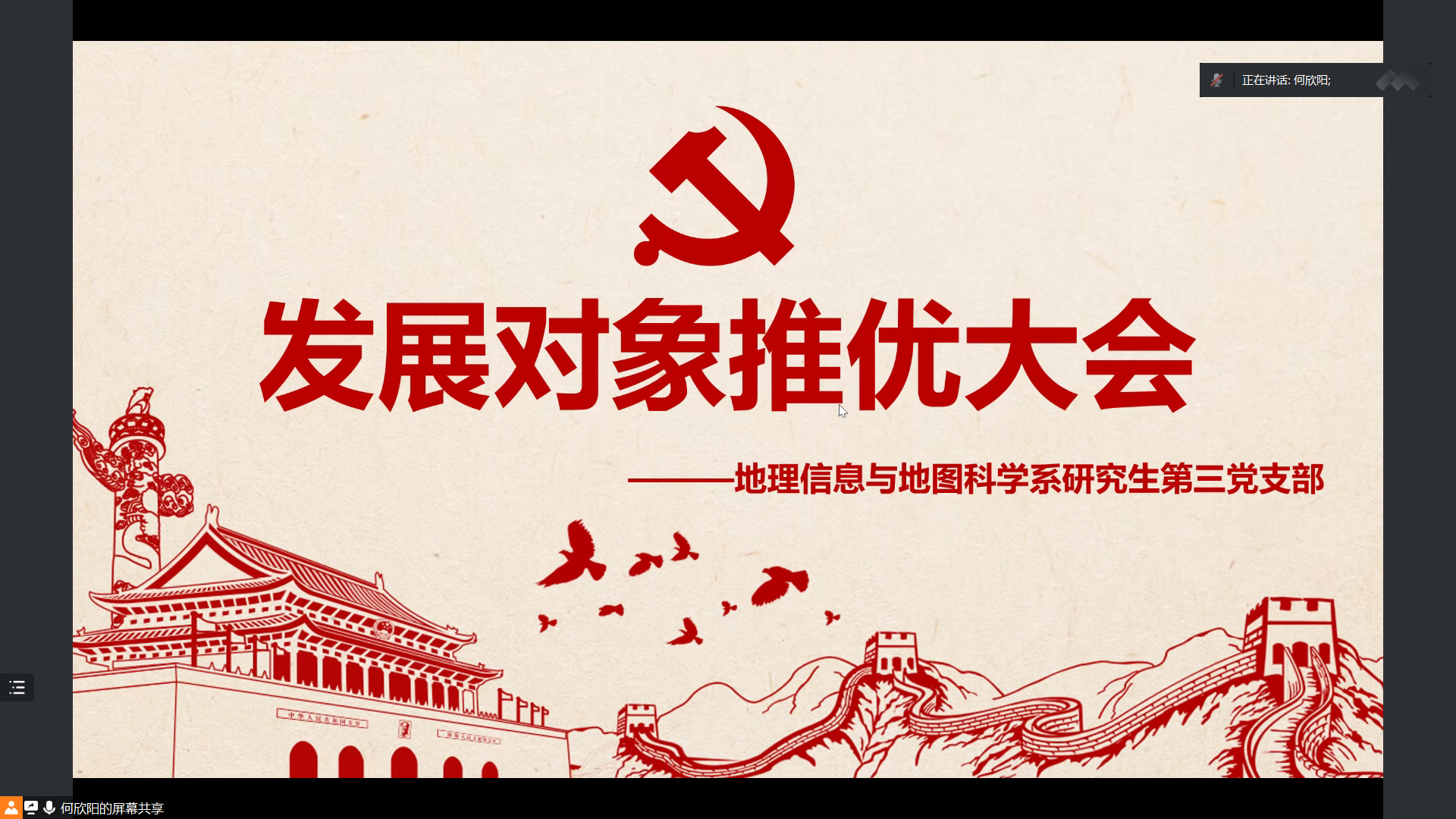 2023年4月26日晚七点,地理信息与地图科学系研究生第三党支部于线上召开“深入学习贯彻习近平生态文明思想——促进建设万物和谐的美丽家园”主题党日活动暨支部大会。本次会议由支部书记何欣阳同志主持。