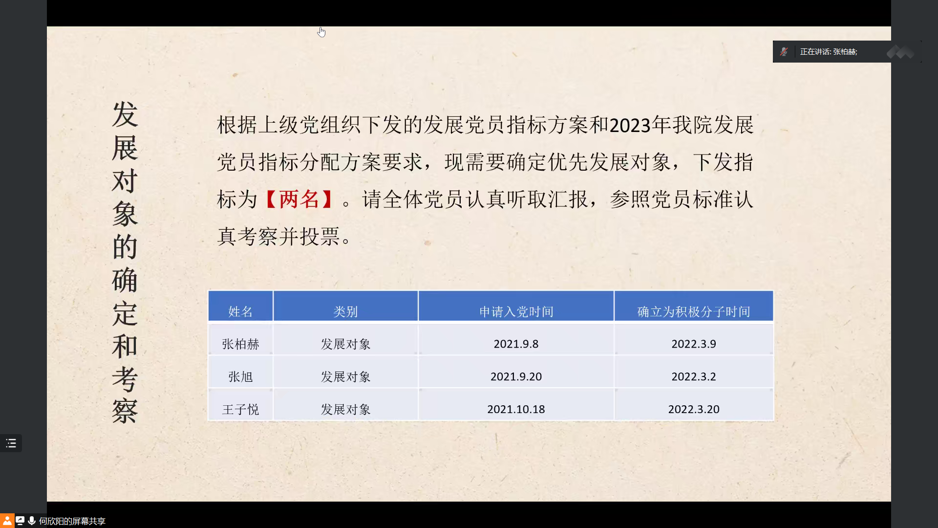 会议第二项,讨论张柏赫、张旭和王子悦三位发展对象的推优工作。根据上级党组织下发的发展党员指标方案和我院2023年发展党员指标分配要求,需要投票选择两名同志优先发展。张柏赫、王子悦分别汇报了自己的基本情况,张旭因事缺席。全体党员认真听取汇报,最后线上投票推选张柏赫、王子悦作为本期推优对象。