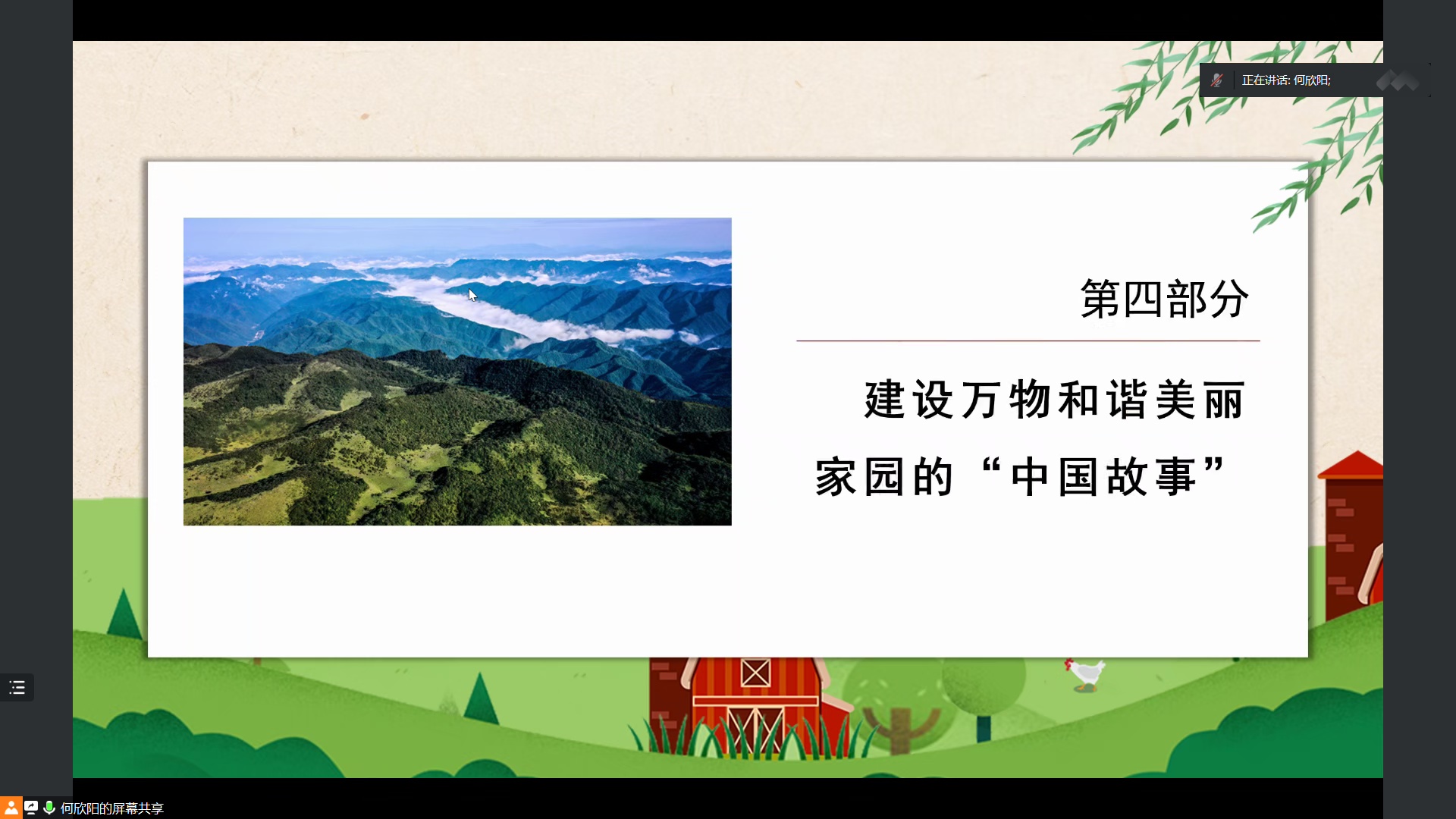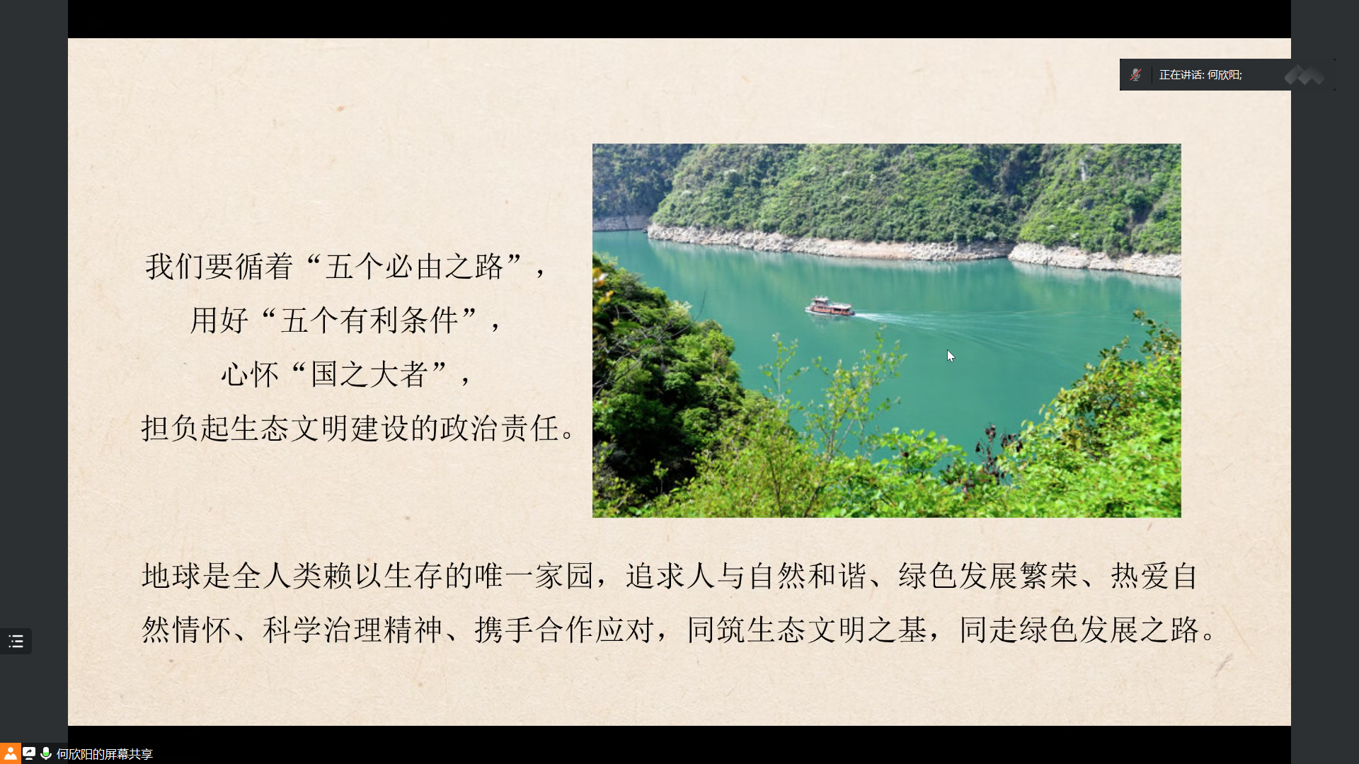 会议第一项,学习解读“深入学习贯彻习近平生态文明思想——促进建设万物和谐的美丽家园”。何欣阳同志介绍了习近平总书记提出的生态文明建设六大原则,从为什么要建设生态文明,建设什么样的生态文明和具体怎样建设生态文明三个方面出发,系统回顾了习近平生态文明思想。随后,何欣阳同志和与会党员分享了建设万物和谐美丽家园的“中国故事”,呼吁大家担负起生态文明建设的政治责任。