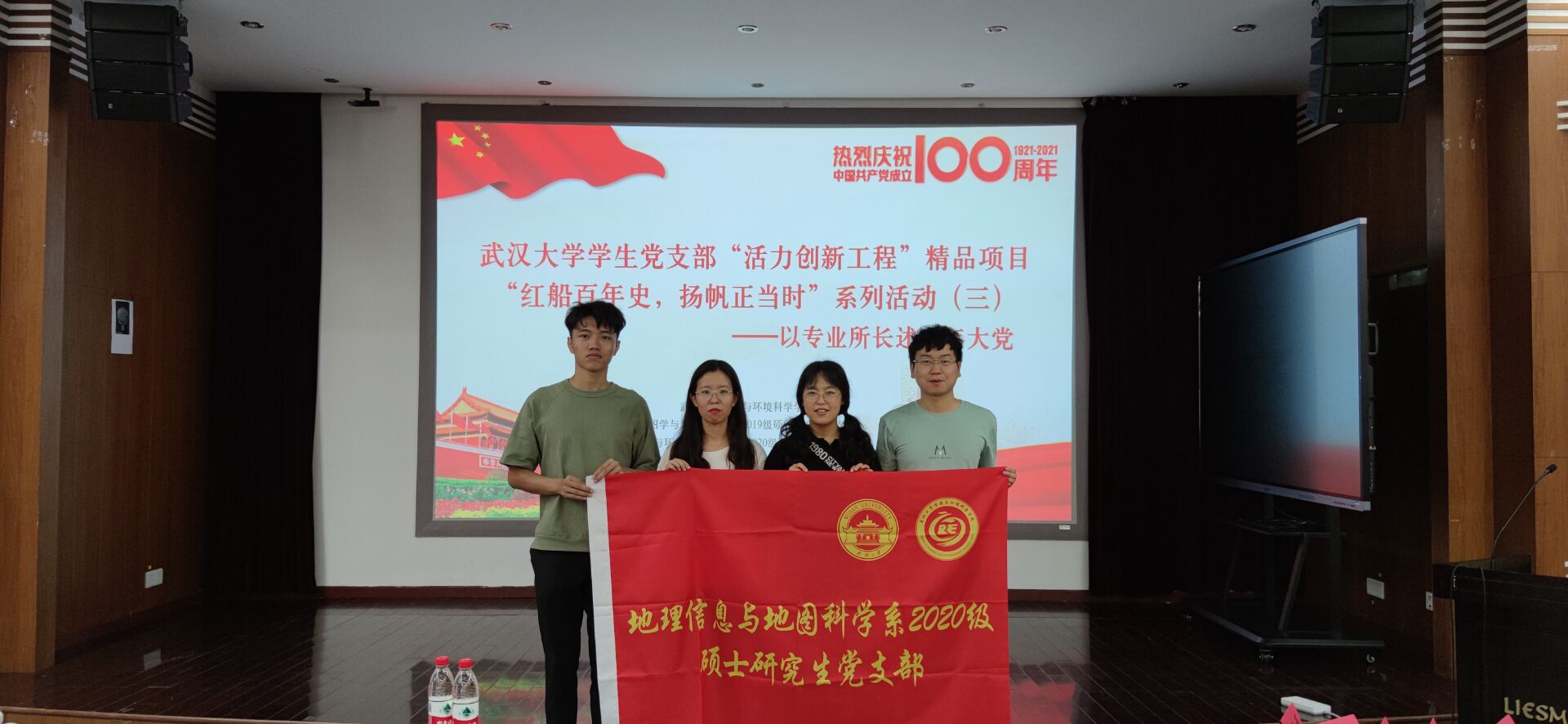 百年征程波澜壮阔,百年初心历久弥坚。为热烈庆祝中国共产党成立100周年,引导广大学生党员和群众深入学习党史、铭记党史,武汉大学2020-2021年学生党支部“活力创新工程”精品项目“红船百年史,扬帆正当时”大学生说百年大党系列活动第三篇——“以专业所长述百年大党”活动于6月1日成功举办。地理信息与地图科学系2020级硕士研究生党支部与团支部联合地图学与地理信息系统2019级硕士研究生党支部进行了“献礼100周年系列多媒体电子地图”的成果展示,经过专家从展现内容、语言表达能力及会场效果三方面的综合评价及打分,最终获得了三等奖的优异成绩。