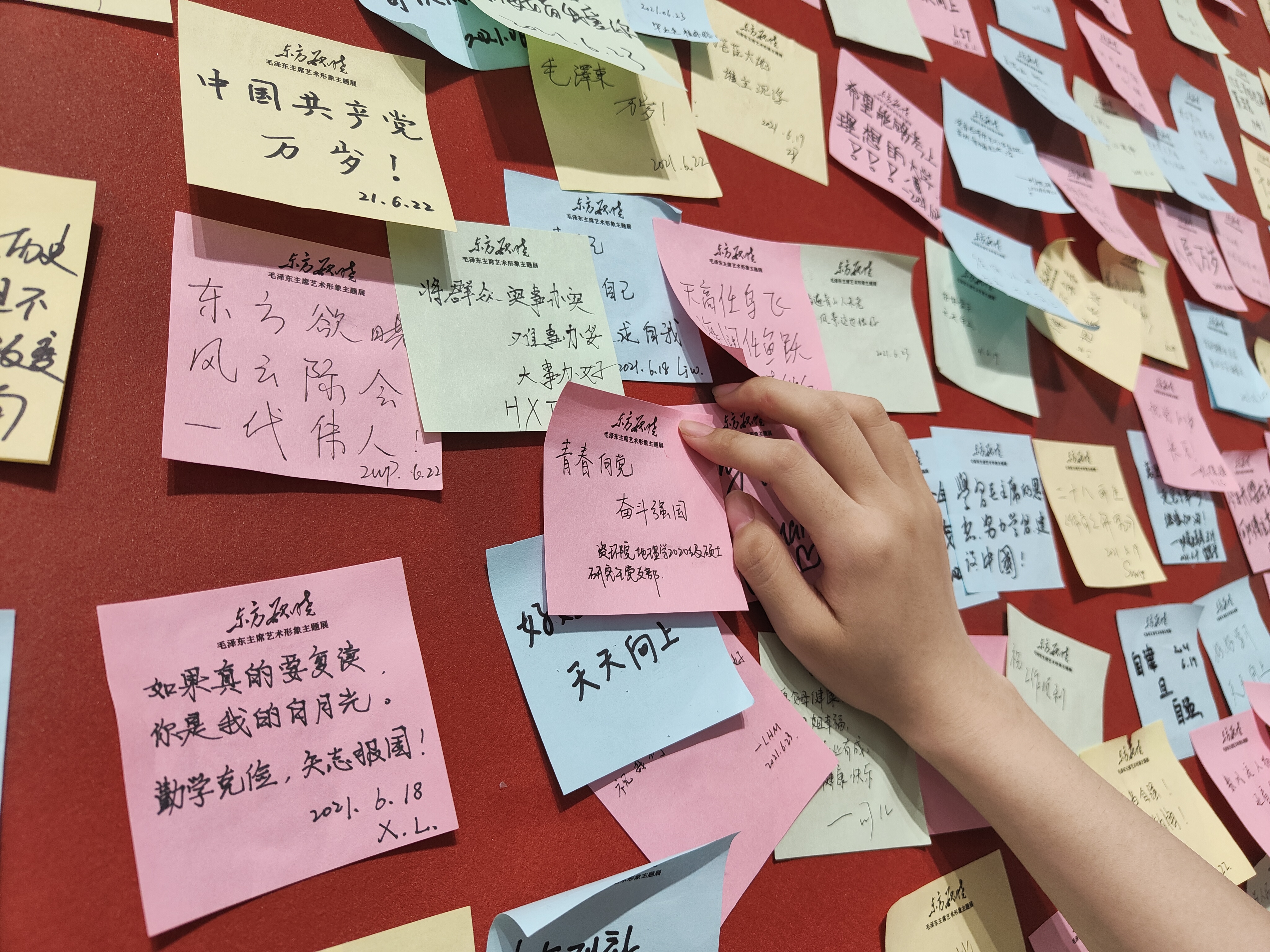 展览主要包括毛泽东主席的革命奋斗历程和毛泽东主席与武汉、毛泽东主席与武汉大学两个板块。从1918年到1974年,毛泽东先后40多次来到武汉,对武汉的革命、建设和发展倾注了大量心血,对武汉人民给予了无限关怀。1958年9月,毛泽东在武汉大学接见“四校”学生,与学生们亲切交谈。展区陈列了许多珍贵的文物和照片,支部同志们认真参观,仿佛置身历史长流中,一点一滴追忆以毛泽东为首的革命先驱者们同心同德、并肩战斗、改天换地创建新中国的峥嵘岁月。不少同志深受感触,在“跟着毛主席读书”互动区留下了自己对未来的寄语。